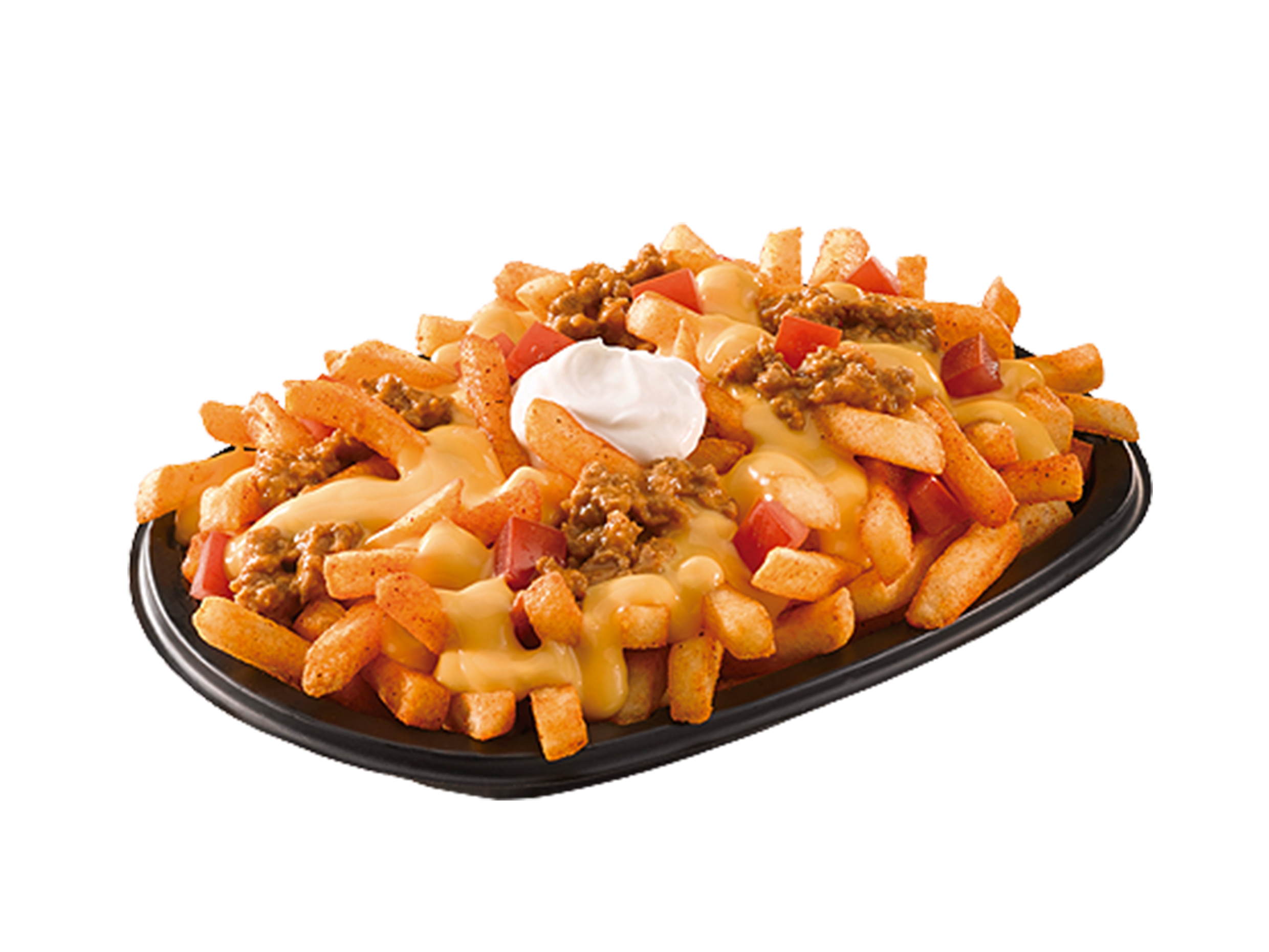 Papas fritas sazonadas, proteína a elección, salsa de queso nacho, sour cream y tomate.