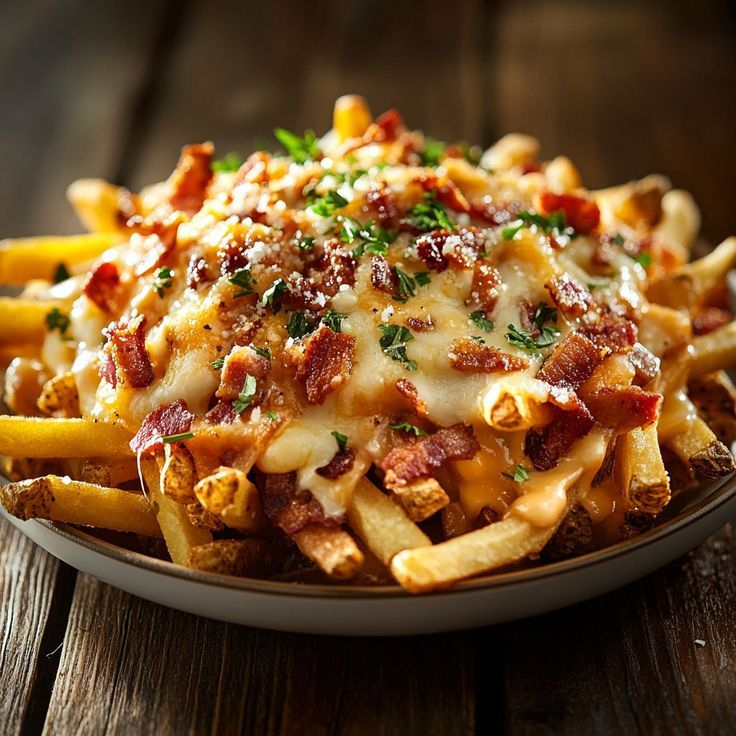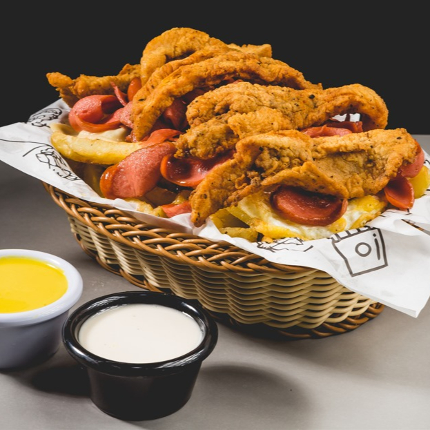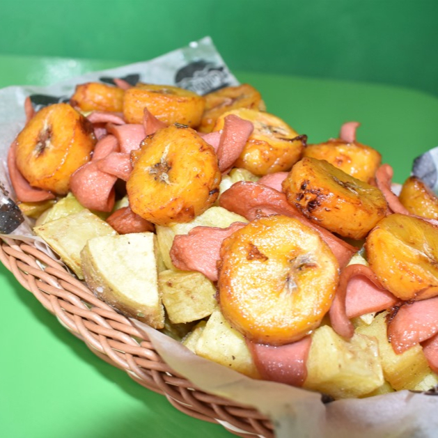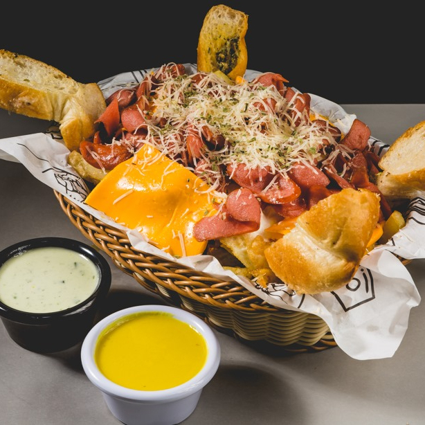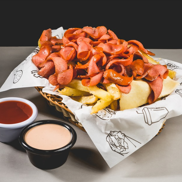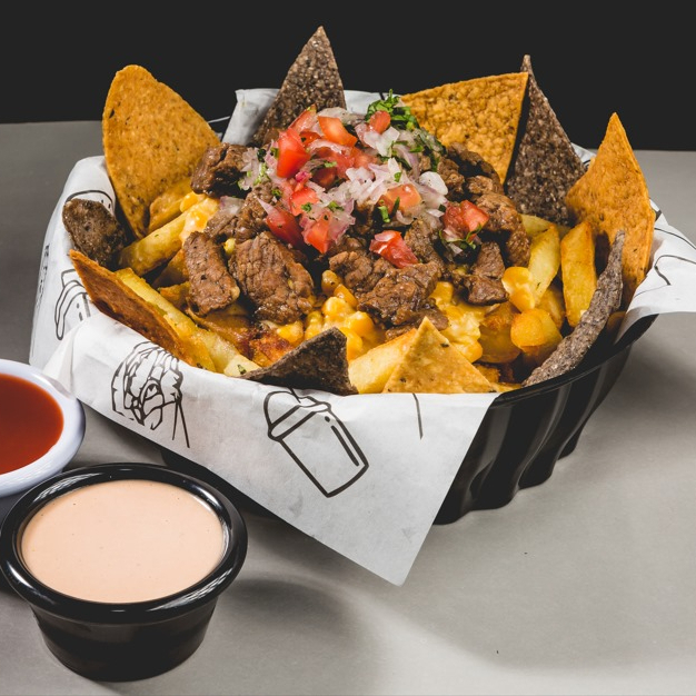 Papas Fritas Picantes + Tocino + Salsa Cheddar + Cebolla + Tomate + Pickles + Salsa de La Casa.