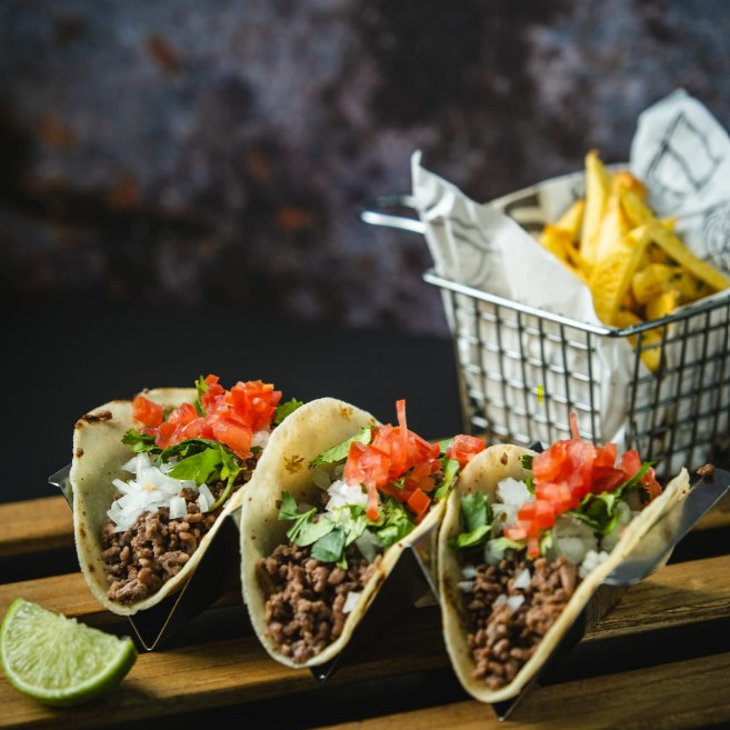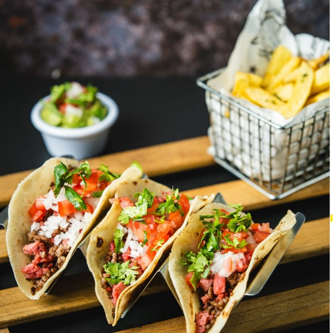 x3 Und de Taquitos de Carne + Pico de Gallo + Jalapeños + Ensalada + Papas.