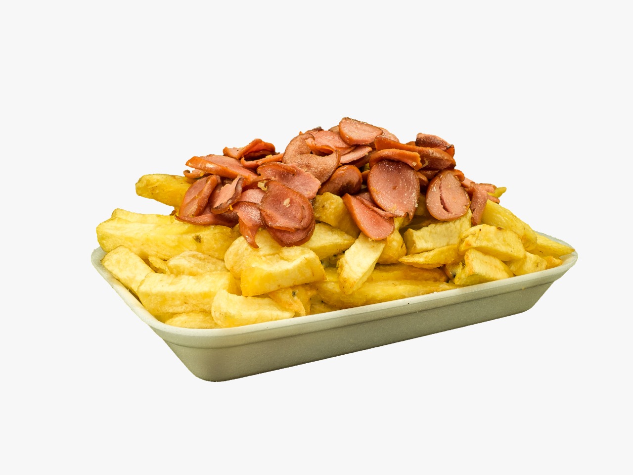 Papas fritas, pollo deshilachado, chorizo parrillero, hot dog, acompañados de cremas (mayonesa, kétchup, mostaza, tártara, golf, guacamole crema de palta, ají y aceituna).