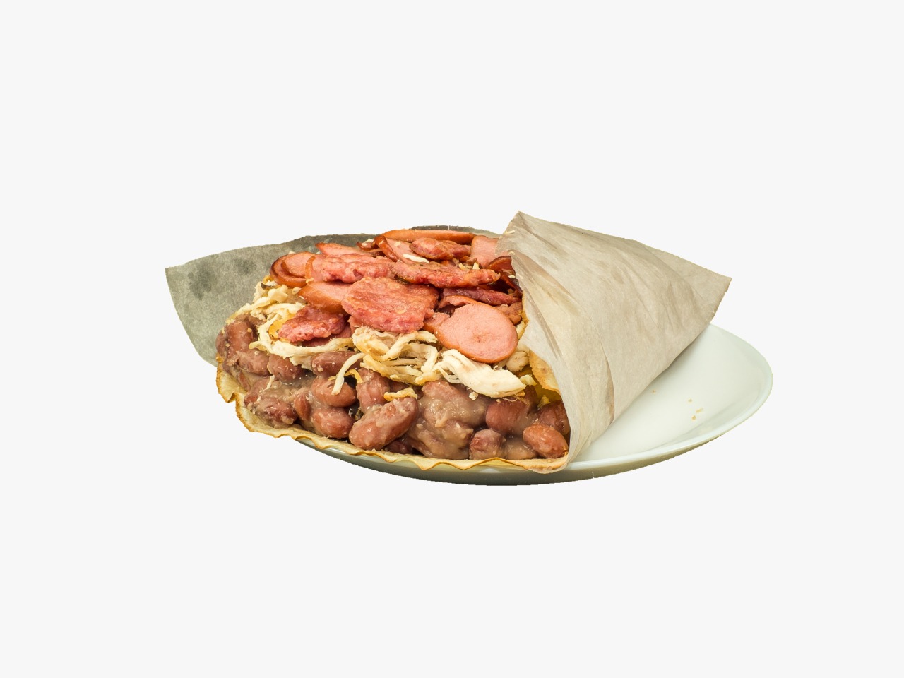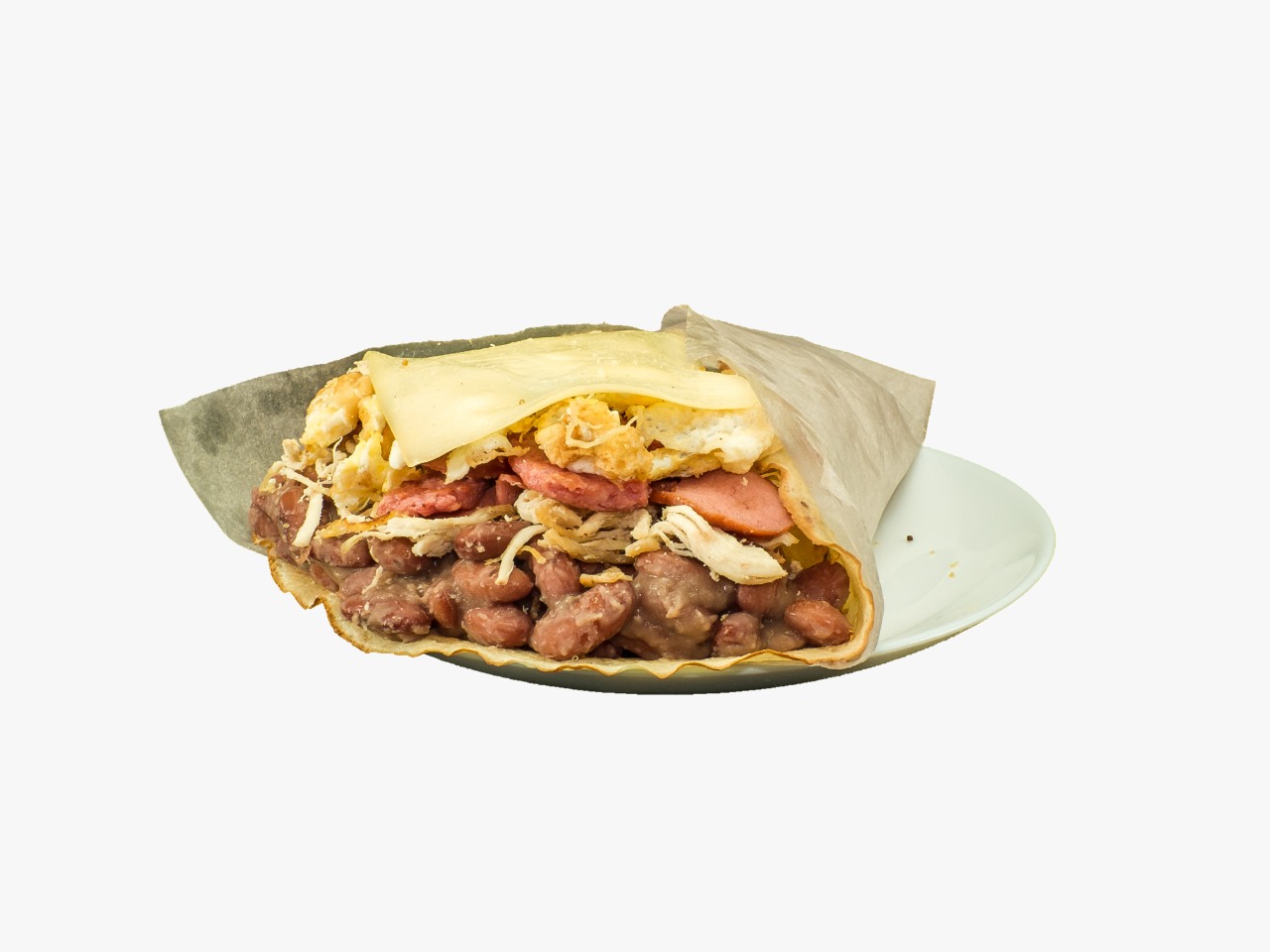 Tortilla con pollo deshilachado, chorizo parrillero, hot dog, huevo frito, queso Edam, frijol, acompañados de cremas (mayonesa, kétchup, mostaza, tártara, golf, guacamole crema de palta, ají y aceituna).