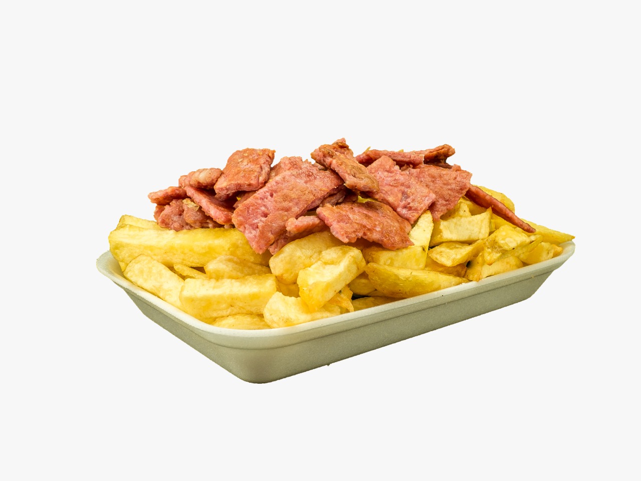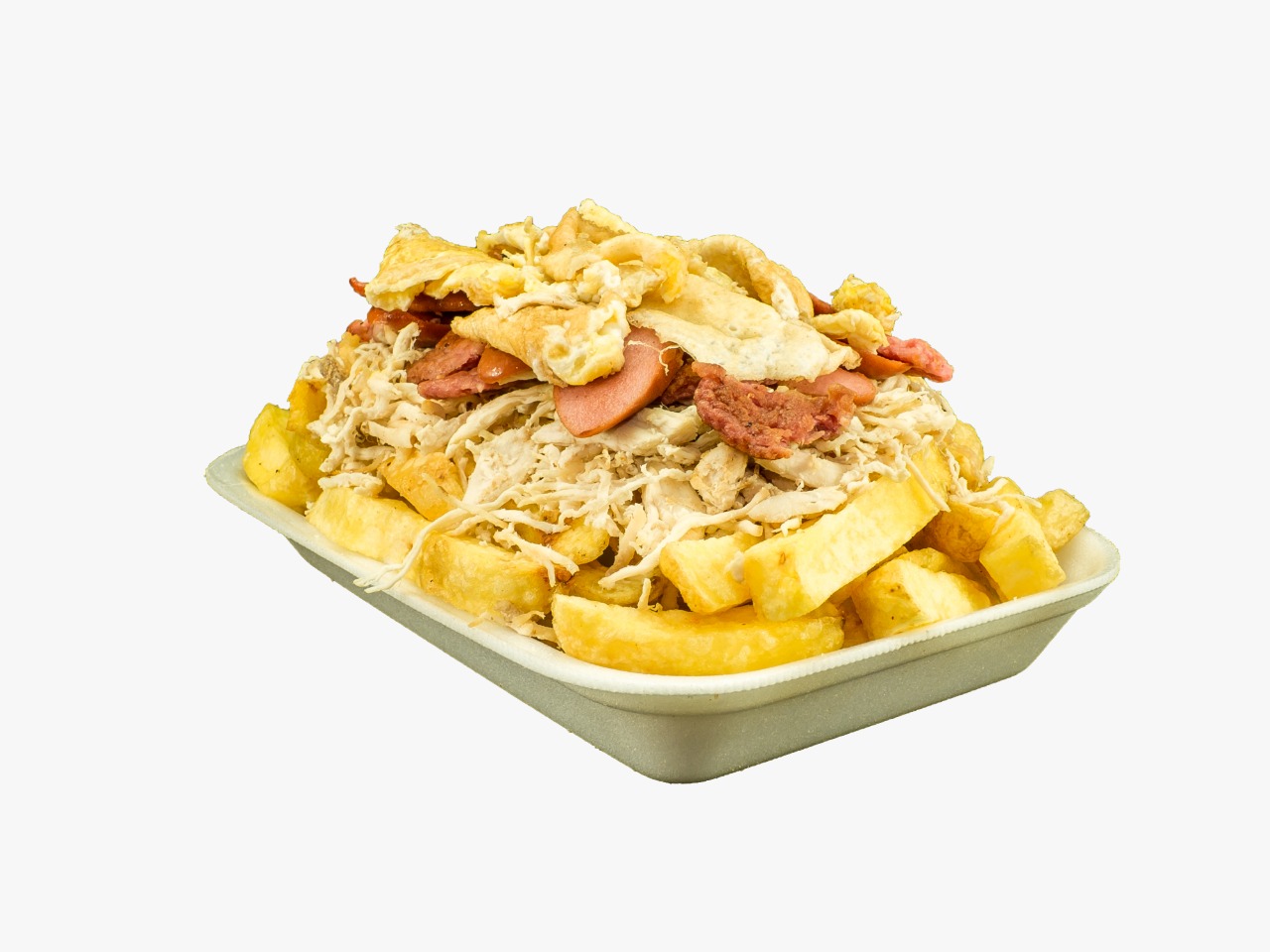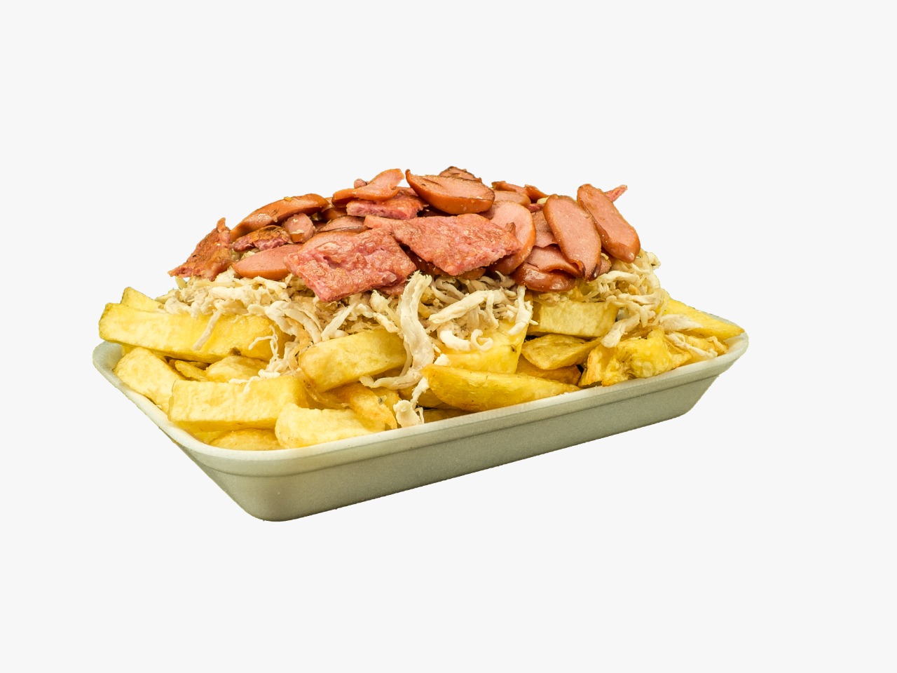 Papas fritas, pollo deshilachado, chorizo parrillero, hot dog, huevo frito, acompañados de cremas (mayonesa, kétchup, mostaza, tártara, golf, guacamole crema de palta, ají y aceituna).