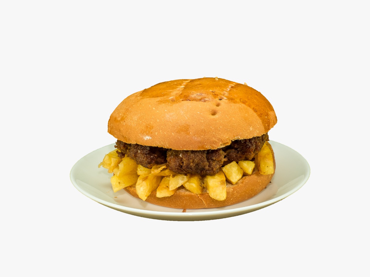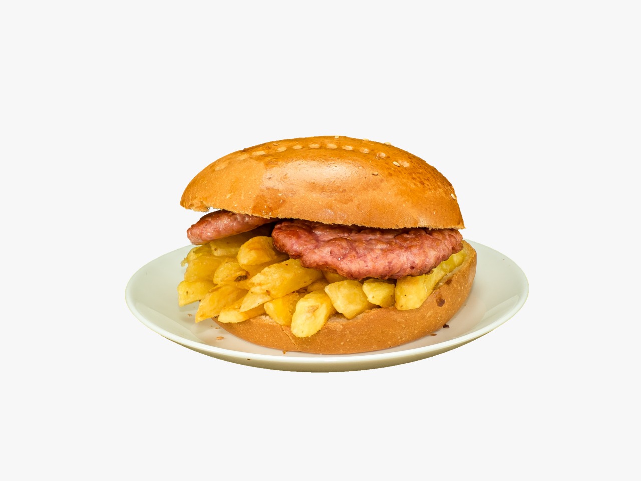 Pan de hamburguesa con hamburguesa de carne, papas fritas, acompañados de cremas (mayonesa, kétchup, mostaza, tártara, golf, guacamole crema de palta, ají y aceituna).