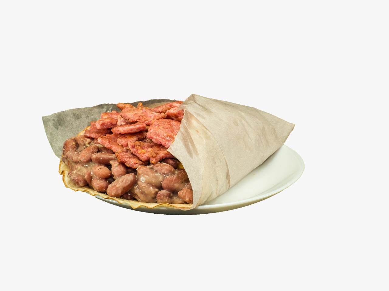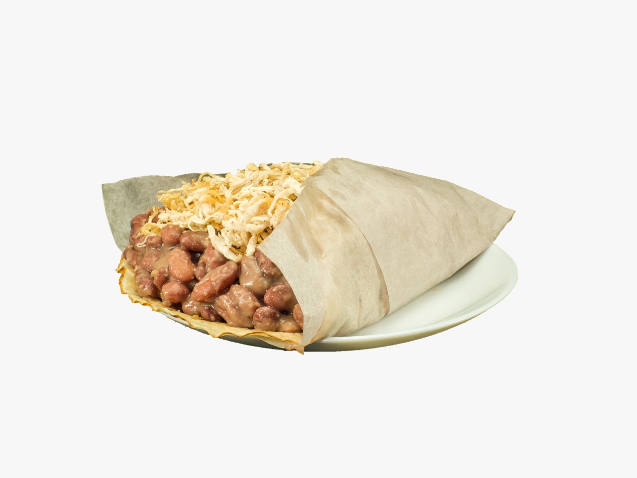Tortilla con pollo deshilachado, frijol, acompañados de cremas (mayonesa, kétchup, mostaza, tártara, golf, guacamole crema de palta, ají y aceituna).