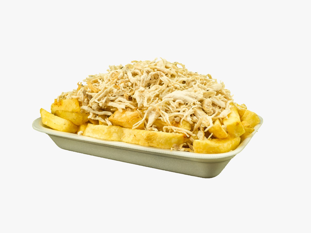 Pollo deshilachado con papas fritas, acompañados de cremas (mayonesa, kétchup, mostaza, tártara, golf, guacamole crema de palta, ají y aceituna).