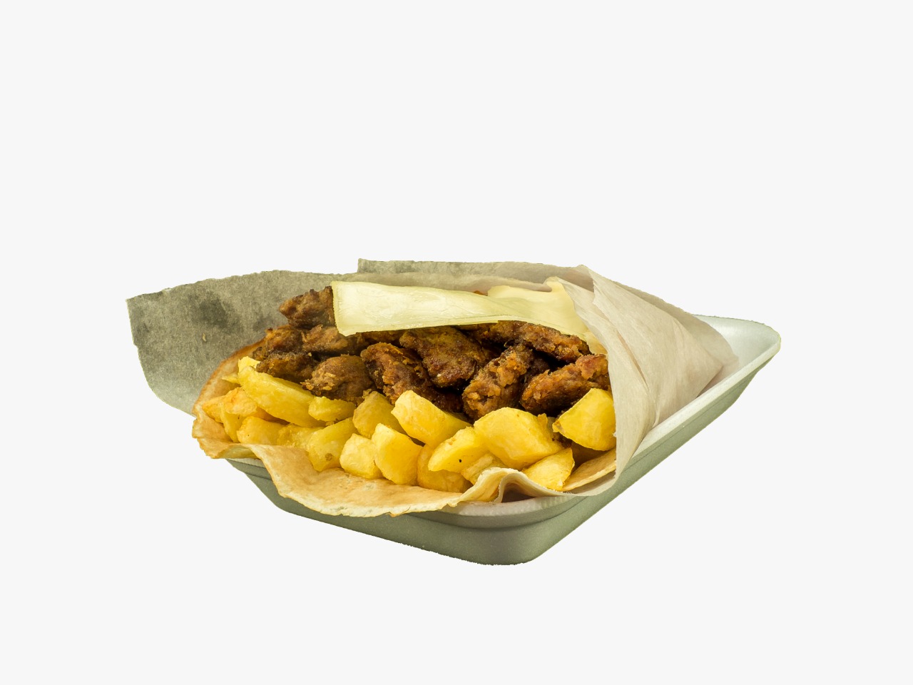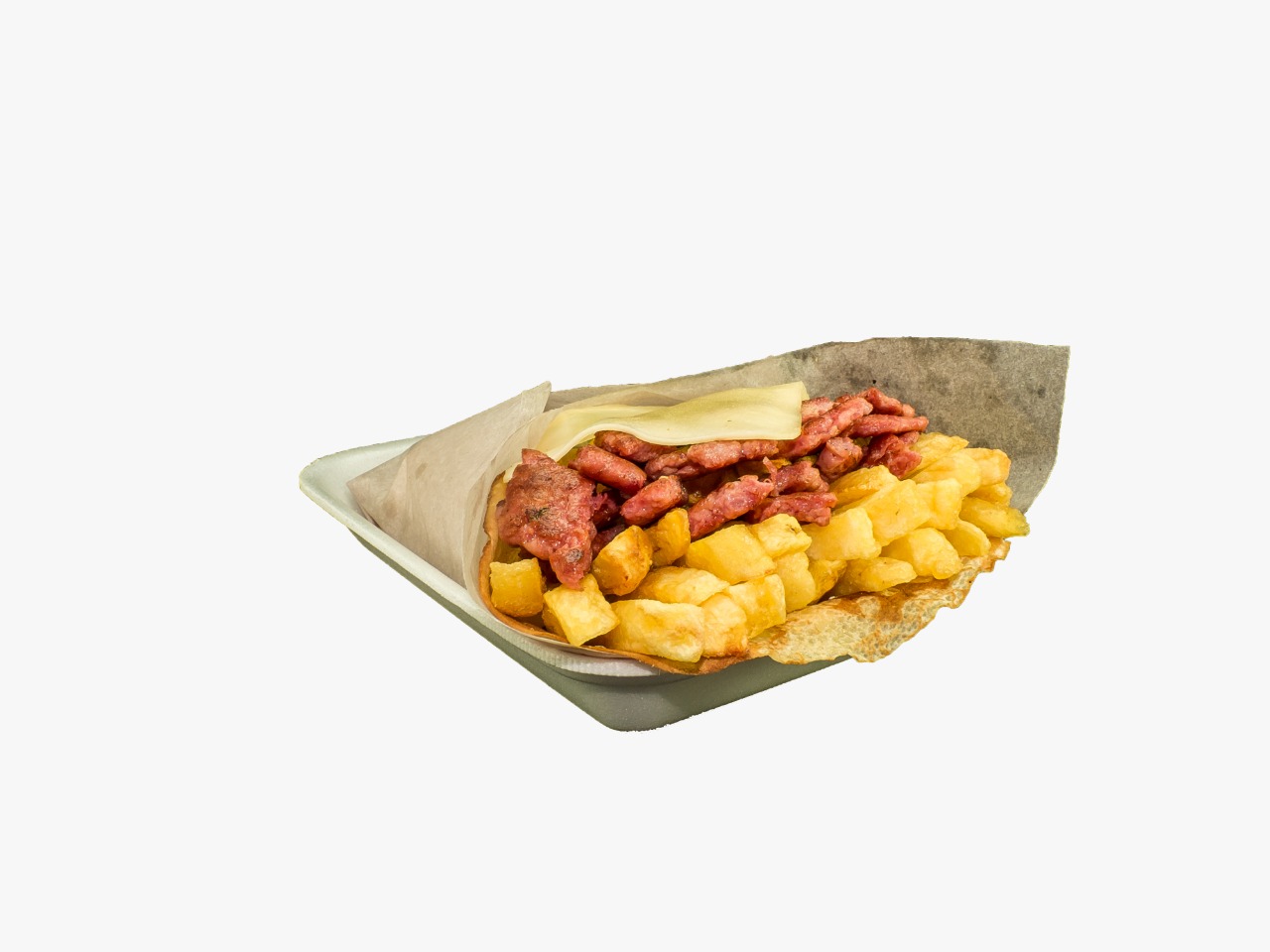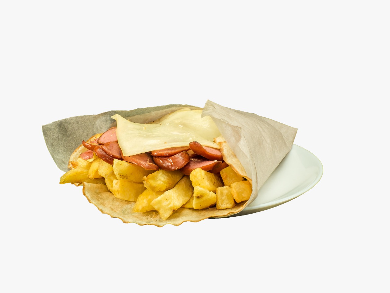 Tortilla con hamburguesa de carne, papas fritas, queso Edam, acompañados de cremas (mayonesa, kétchup, mostaza, tártara, golf, guacamole, crema de palta, ají y aceituna).