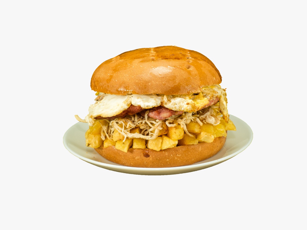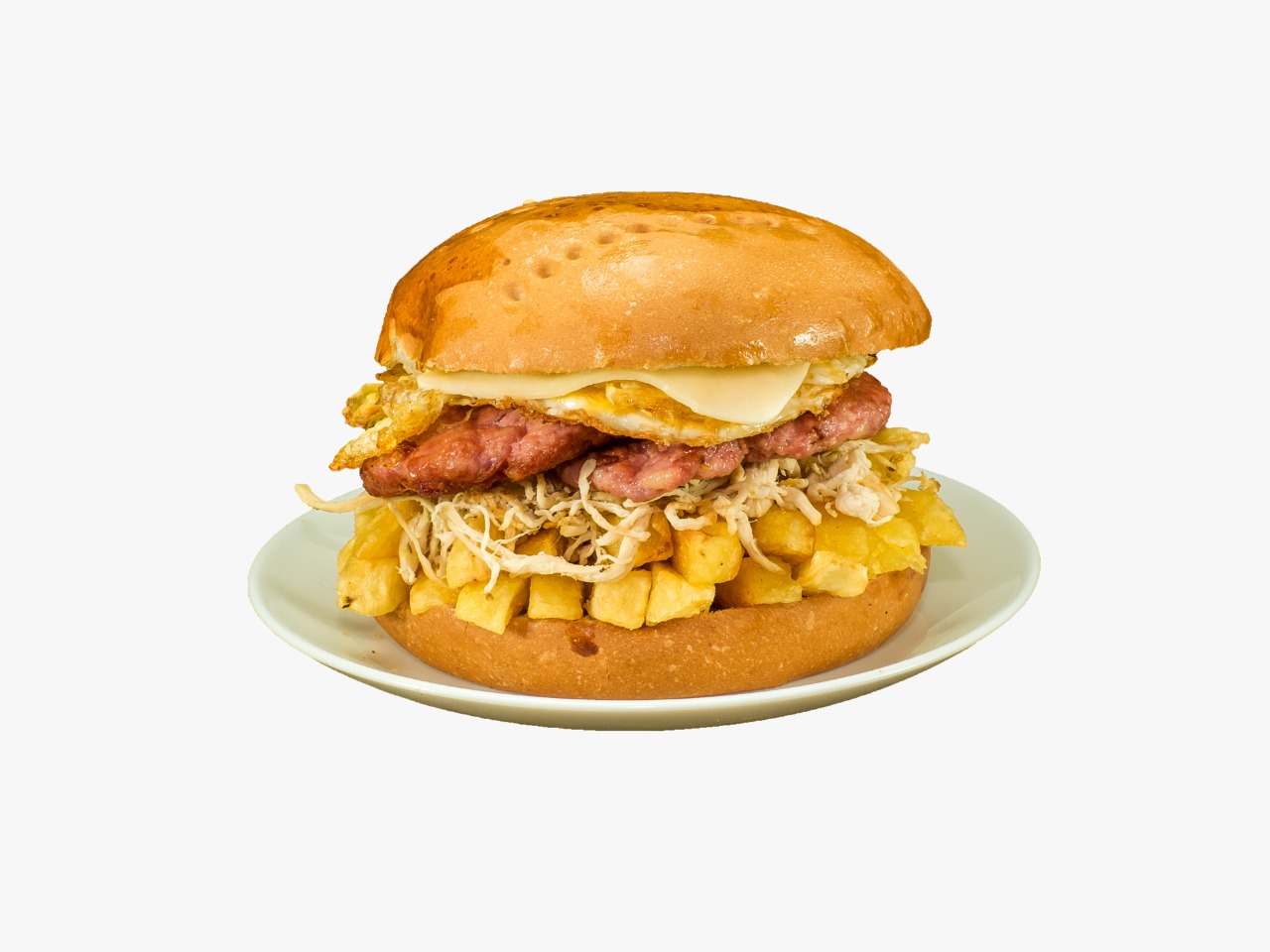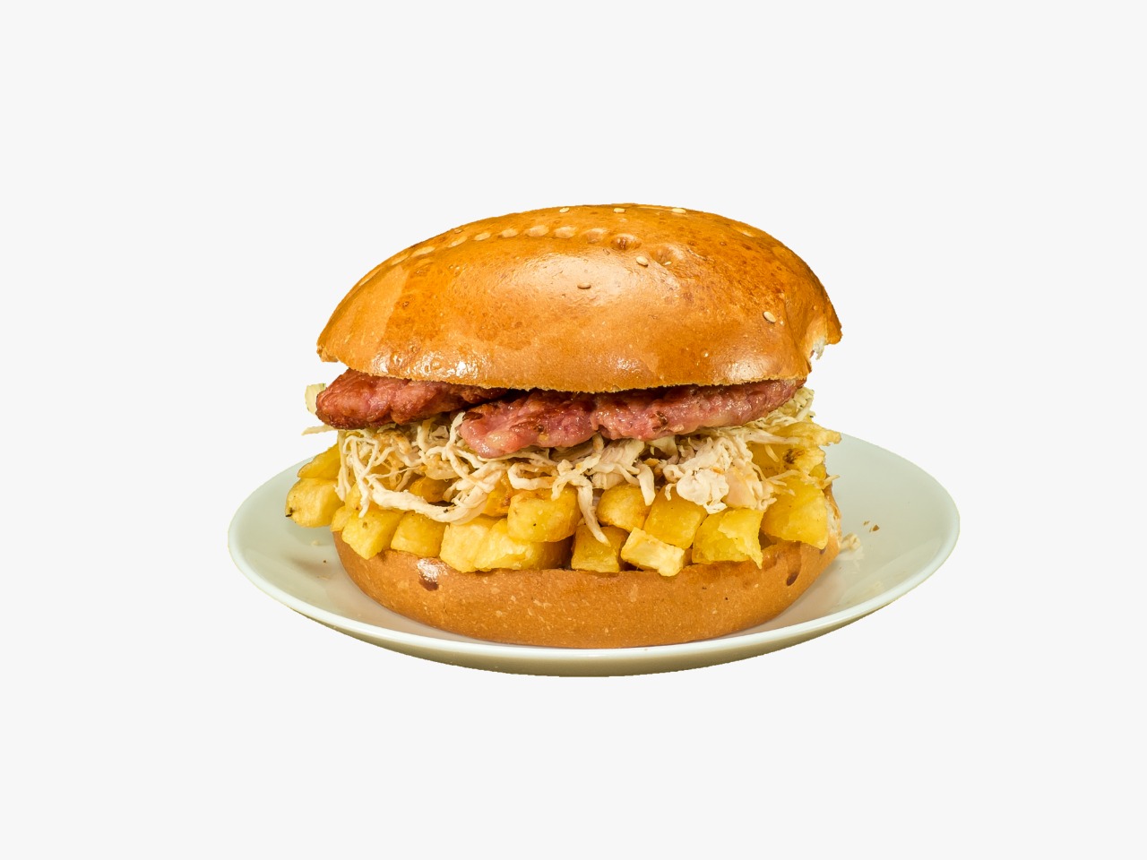 Pan de hamburguesa con pollo deshilachado, chorizo parrillero, huevo frito, queso Edam, papas fritas, acompañadas de cremas (mayonesa, kétchup, mostaza, tártara, golf, guacamole crema de palta, ají y aceituna).