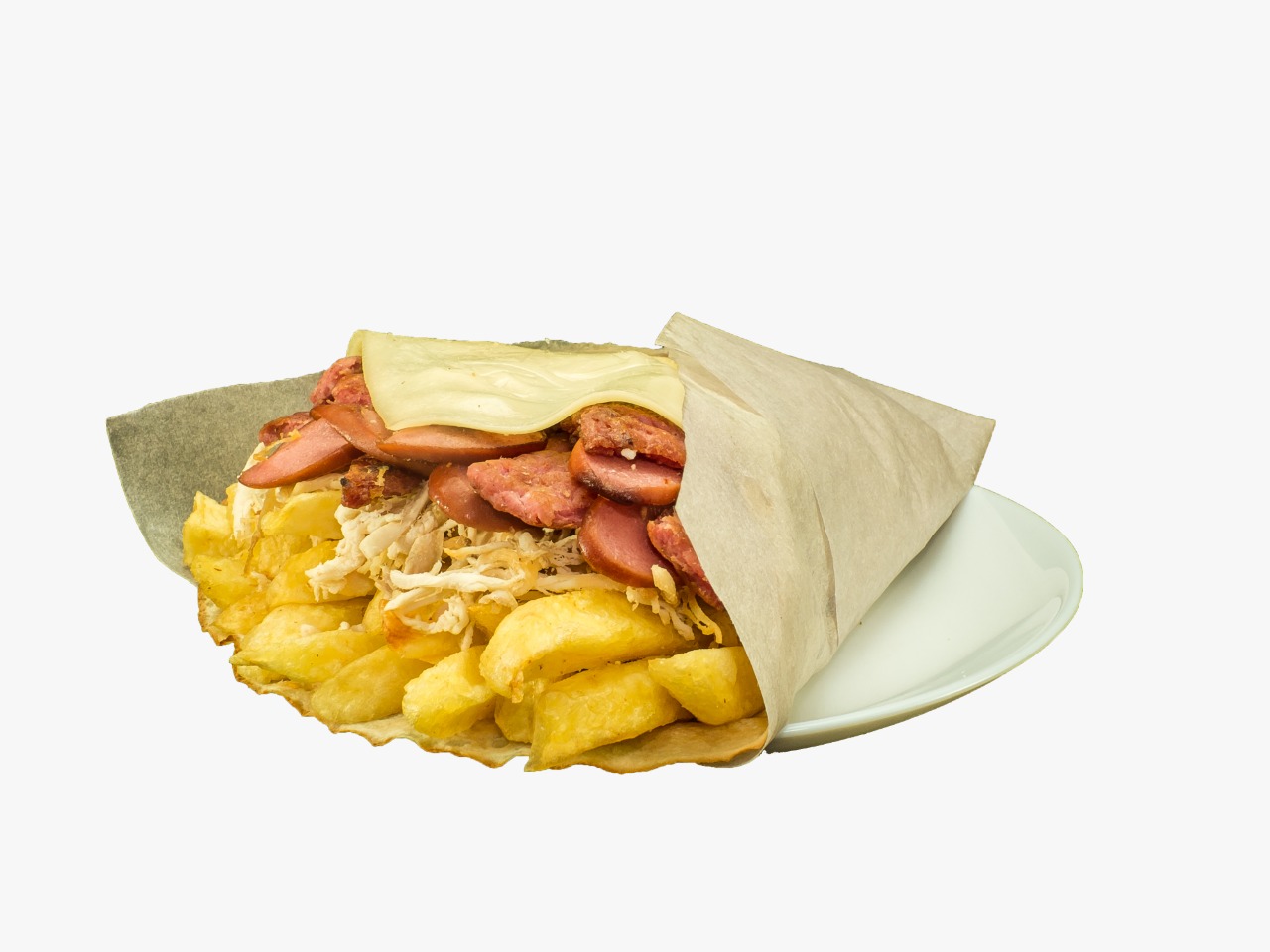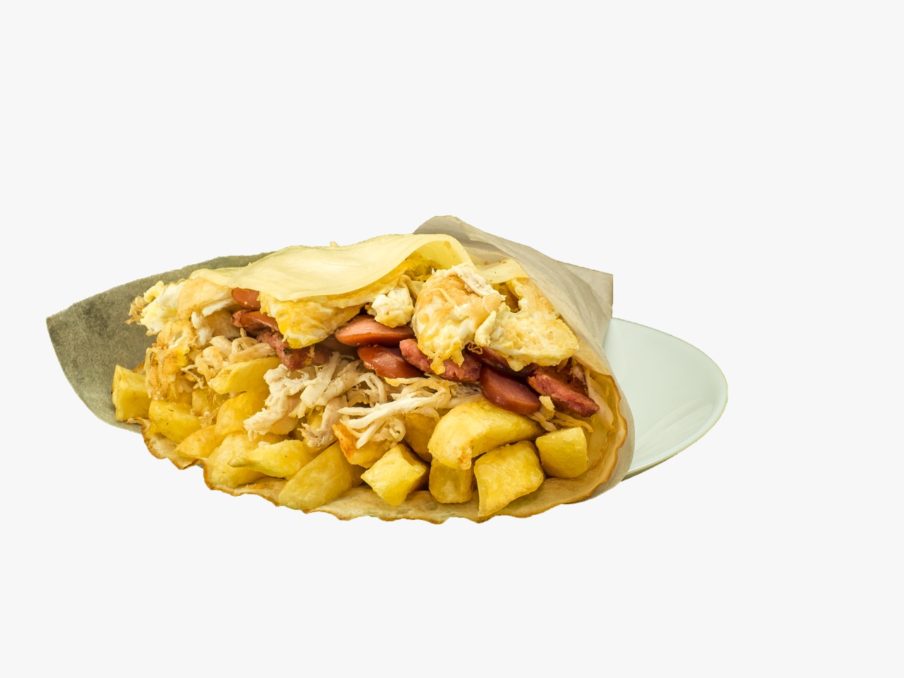 Tortilla con pollo deshilachado, chorizo parrillero, hot dog, huevo frito, papas fritas, queso Edam, acompañados de cremas (mayonesa, kétchup, mostaza, tártara, golf, guacamole crema de palta, ají y aceituna).
