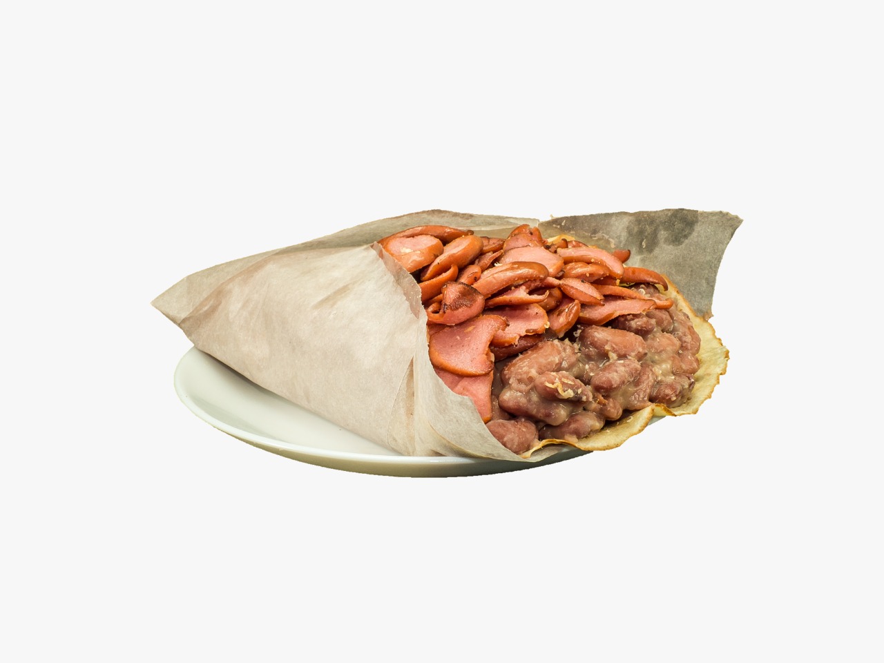 Tortilla con pollo deshilachado, chorizo parrillero, hot dog, frijol, acompañados de cremas (mayonesa, kétchup, mostaza, tártara, golf, guacamole crema de palta, ají y aceituna).
