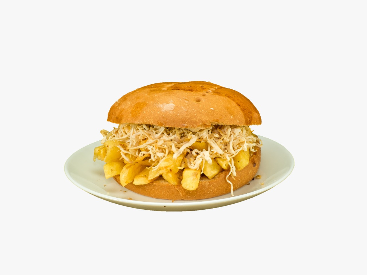 Pan de hamburguesa con pollo deshilachado, papas fritas acompañados de cremas (mayonesa, kétchup, mostaza, tártara, golf, guacamole crema de palta, ají y aceituna).