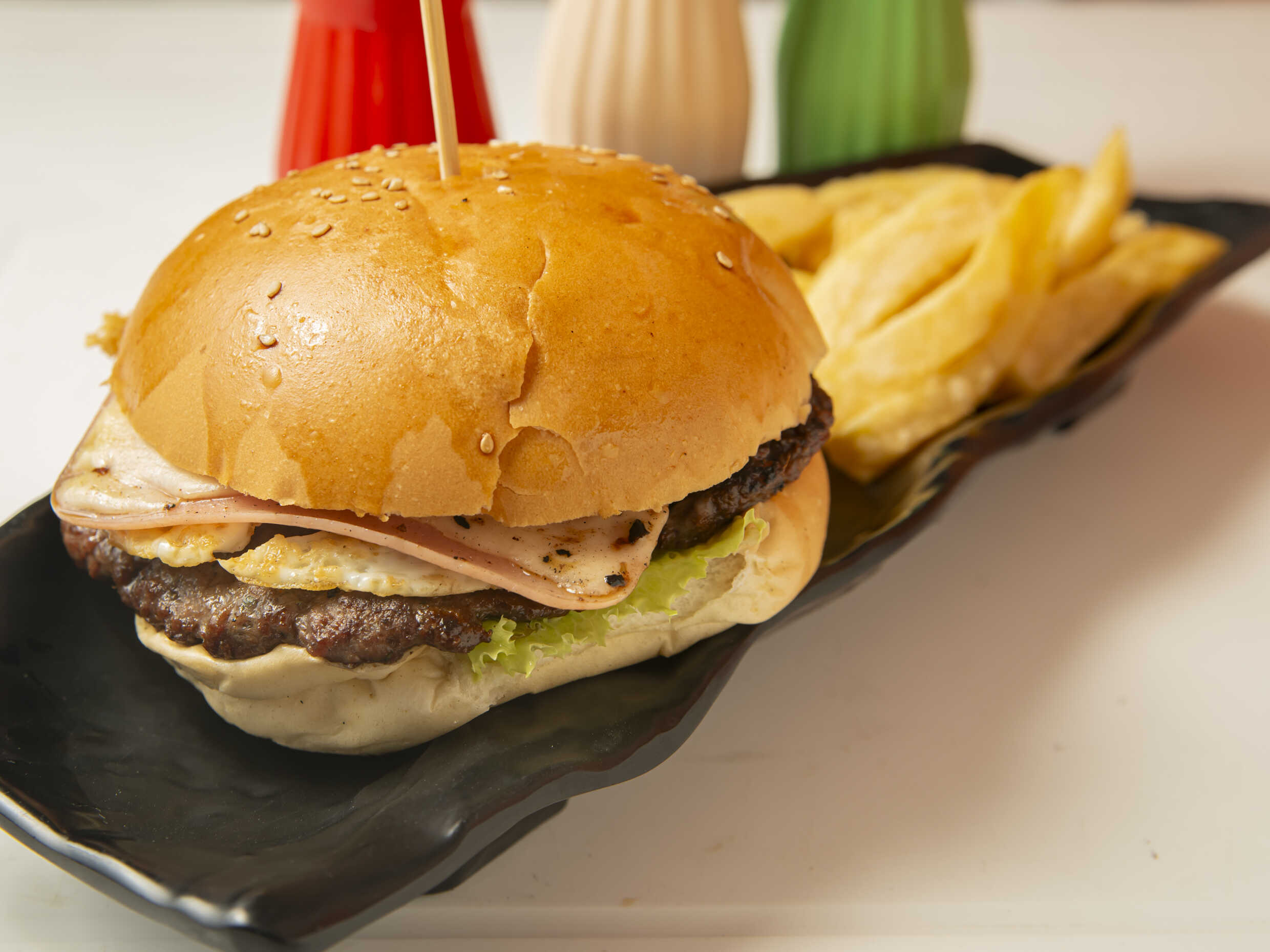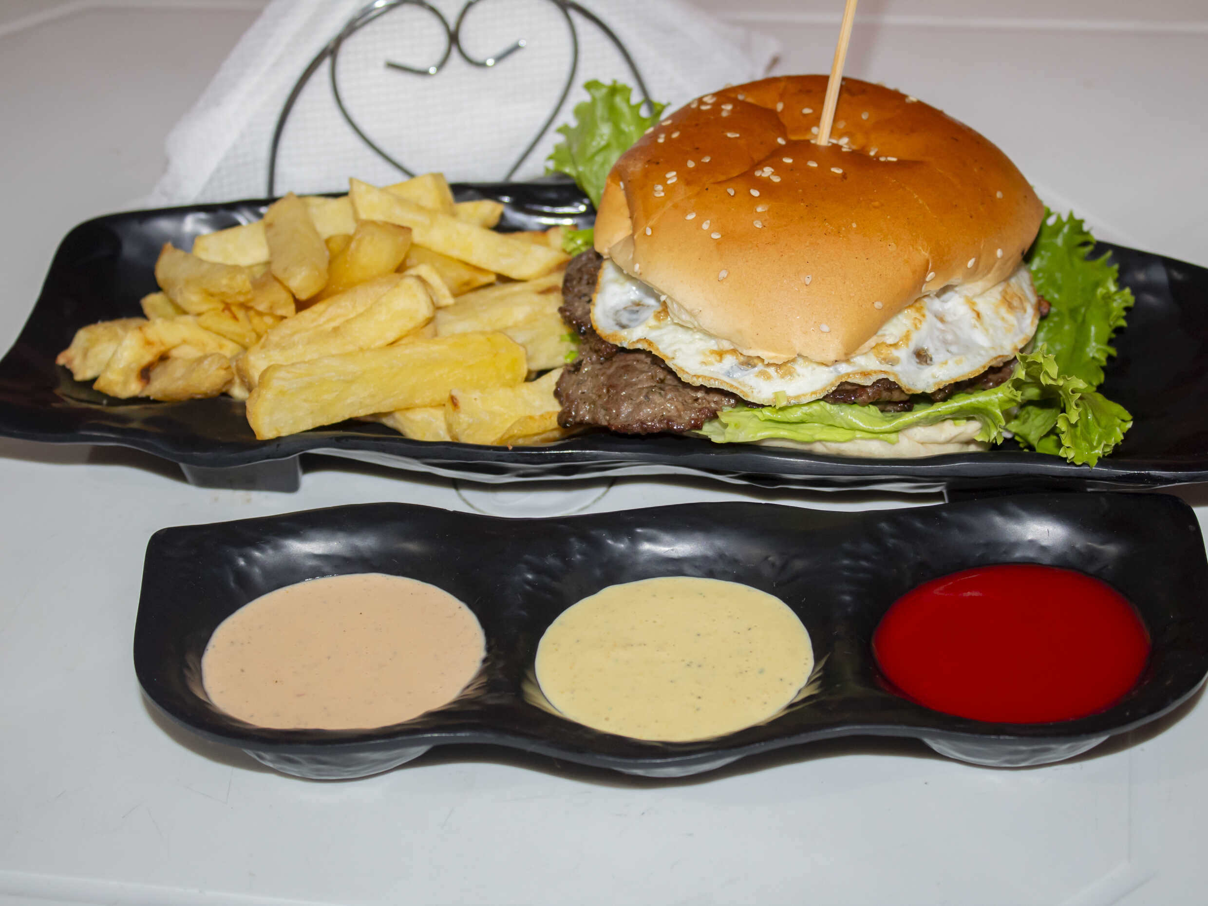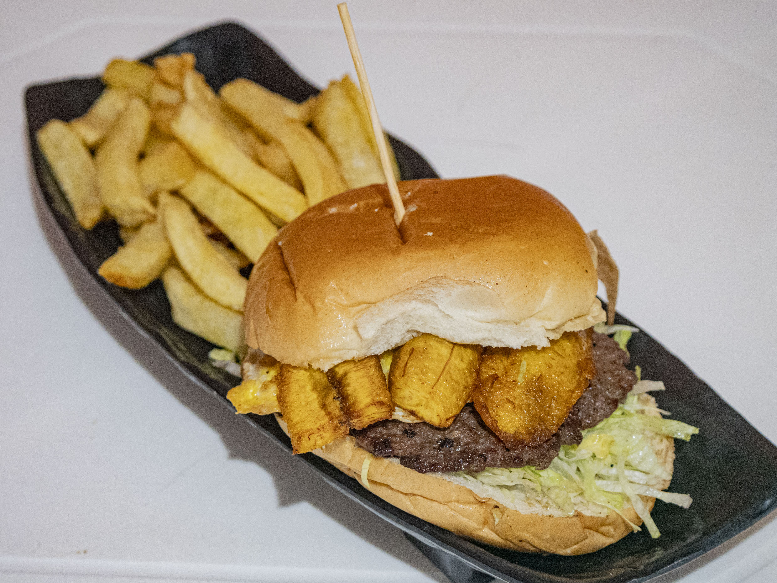 Hamburguesa a lo pobre a elegir entre filete de pollo o carne artesanal, plátano, huevo, pan de hamburguesa, papas fritas y ensalada.
