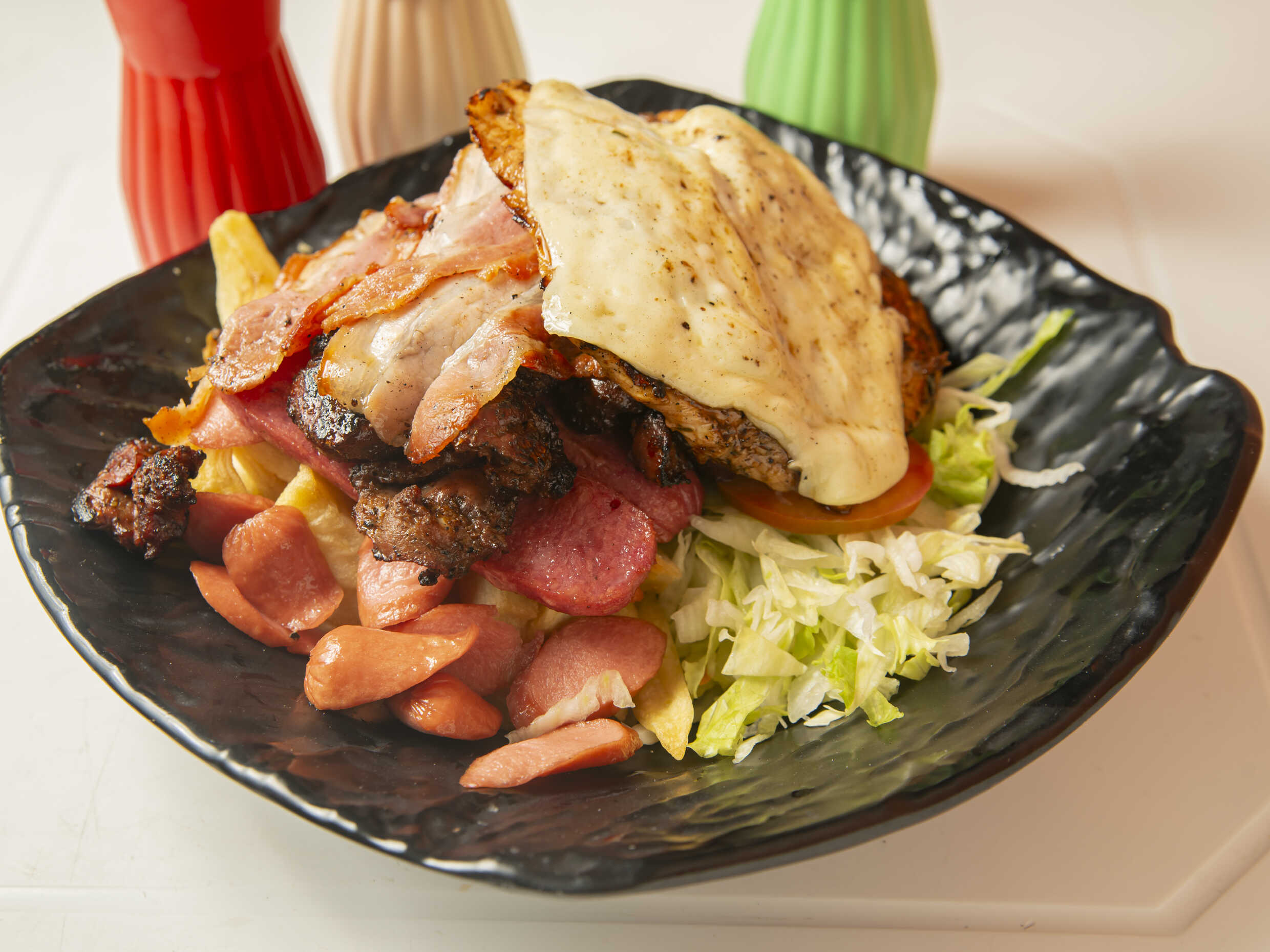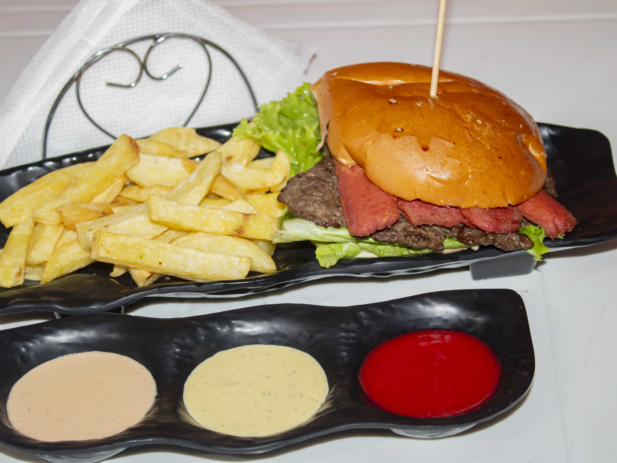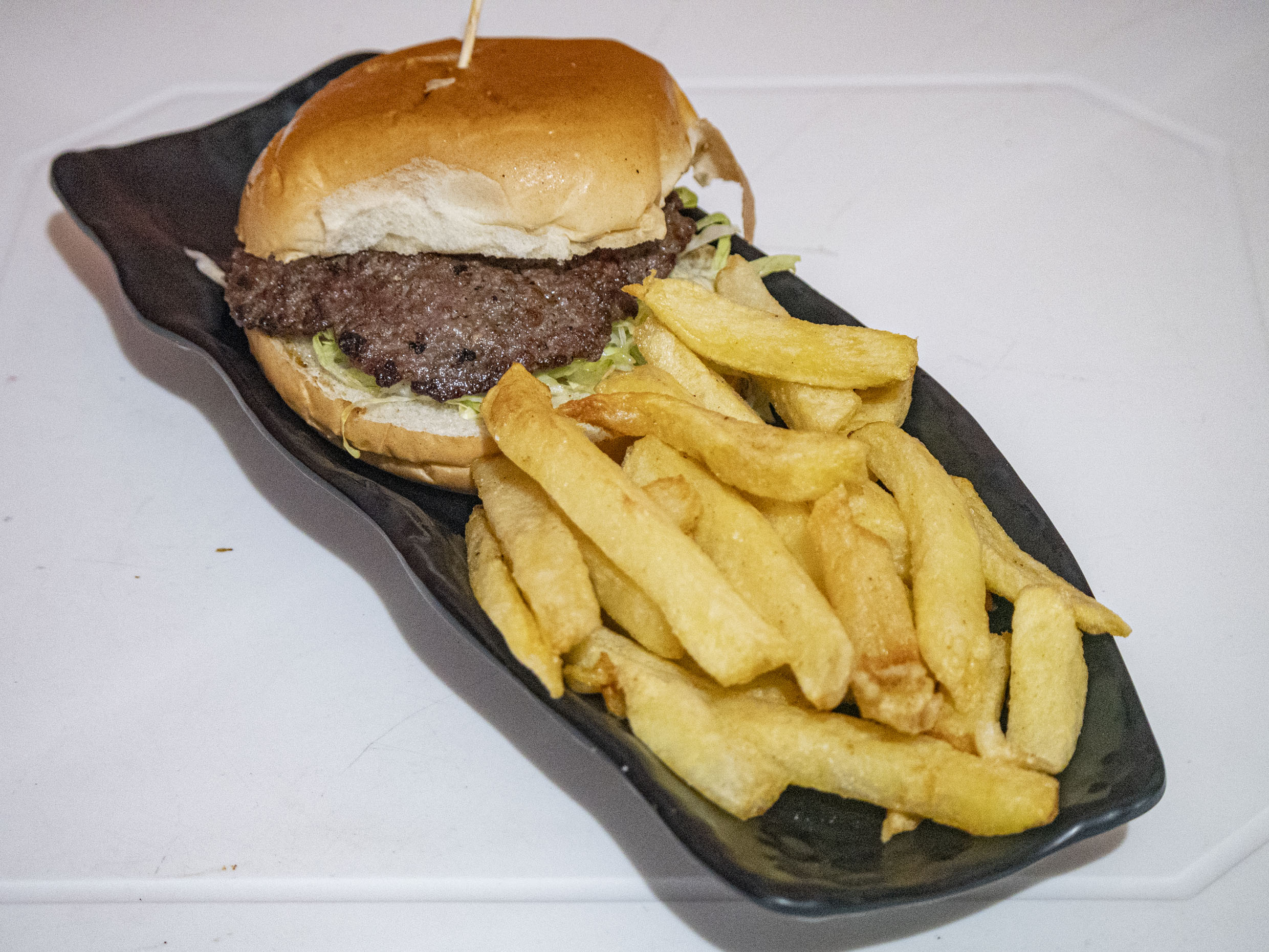 Hamburguesa a lo pobre a elegir entre filete de pollo o carne artesanal, plátano, huevo, pan de hamburguesa, papas fritas y ensalada.
