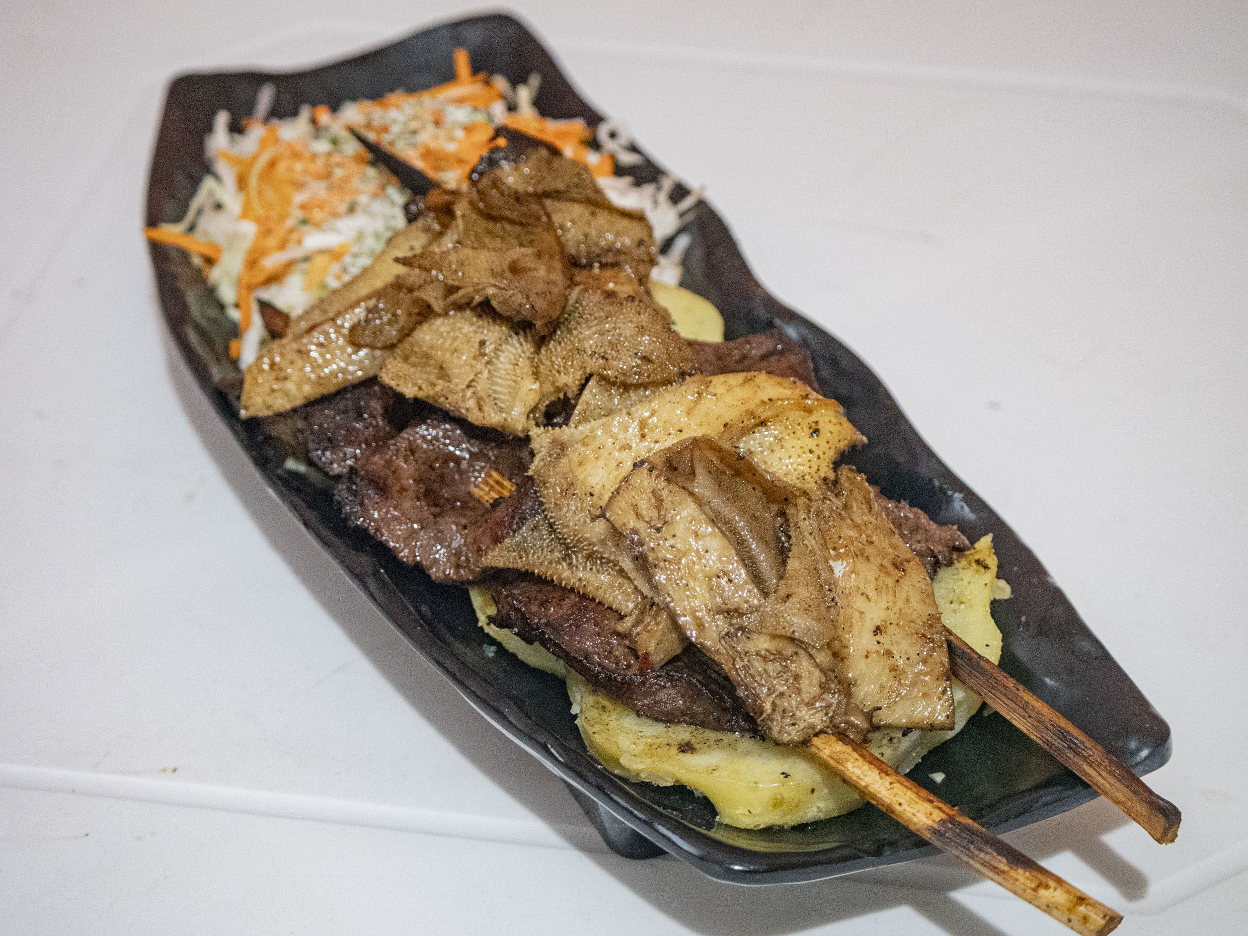 1 Palito de anticucho de corazón de res y pancita con papas al vapor, ensalada fresca más nuestros ajíes de la casa.