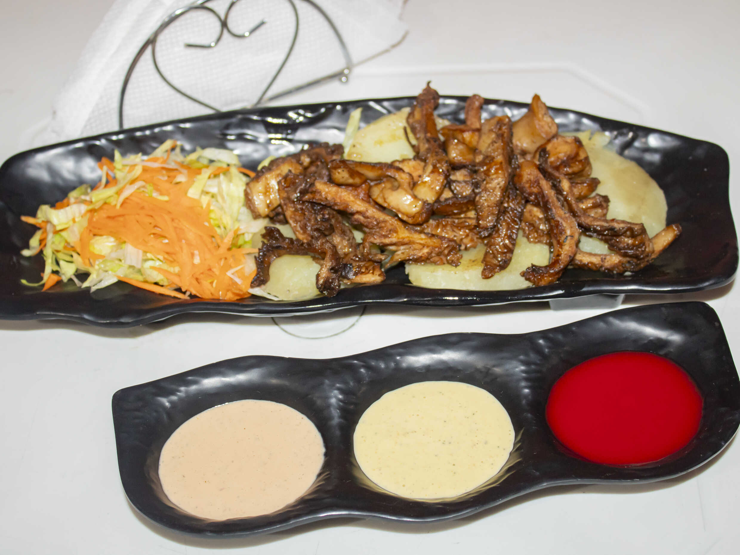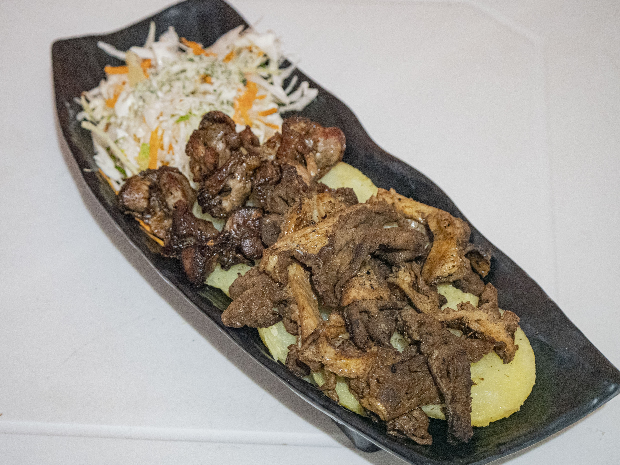Dúo a elegir entre pancita, mollejitas o rachi con papas al vapor, ensalada fresca y nuestros ajíes de la casa.
