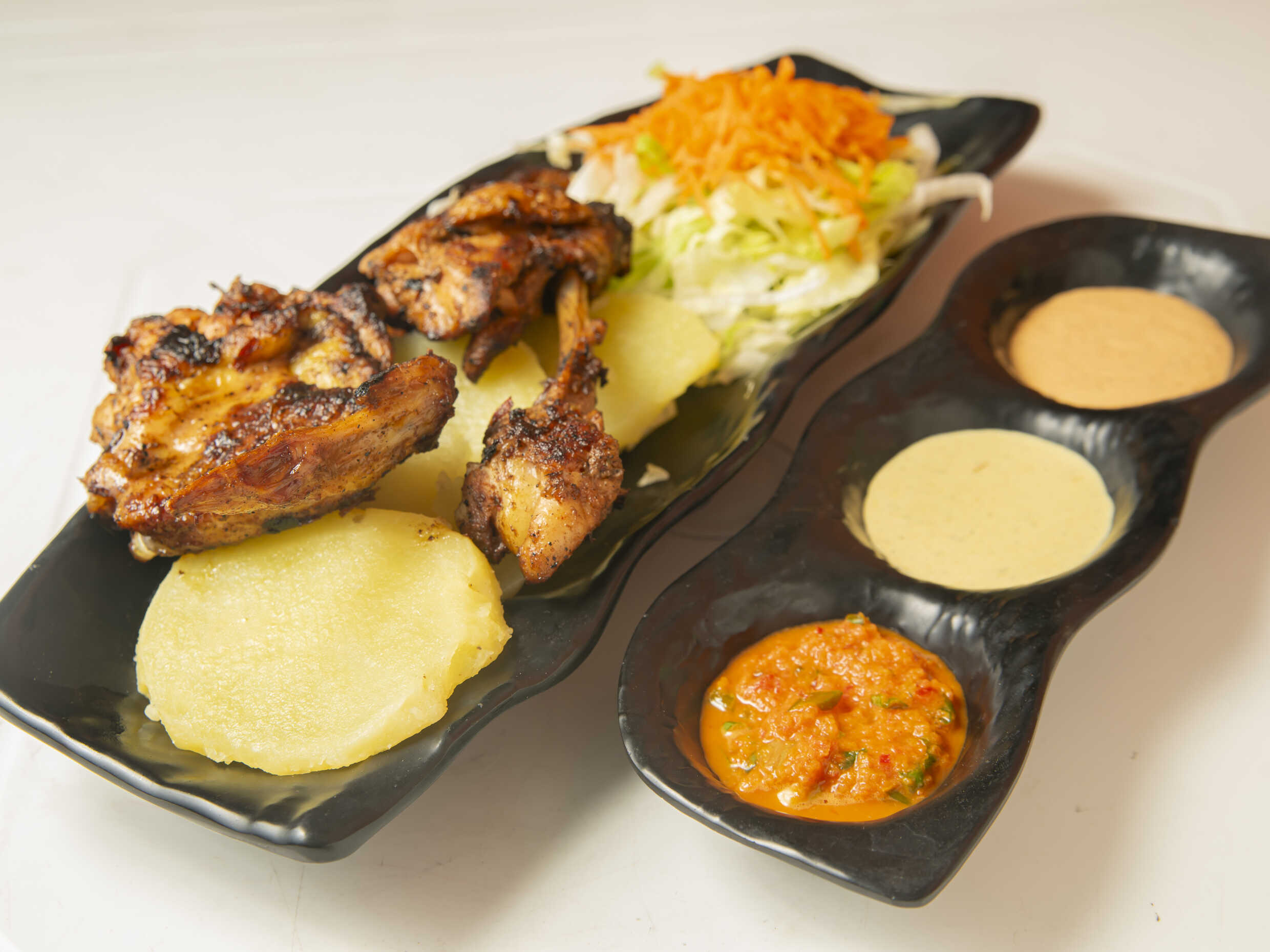 1 Ala a la parrilla, 1 pierna a la parrilla con papas al vapor, ensalada fresca y nuestros ajíes de la casa.