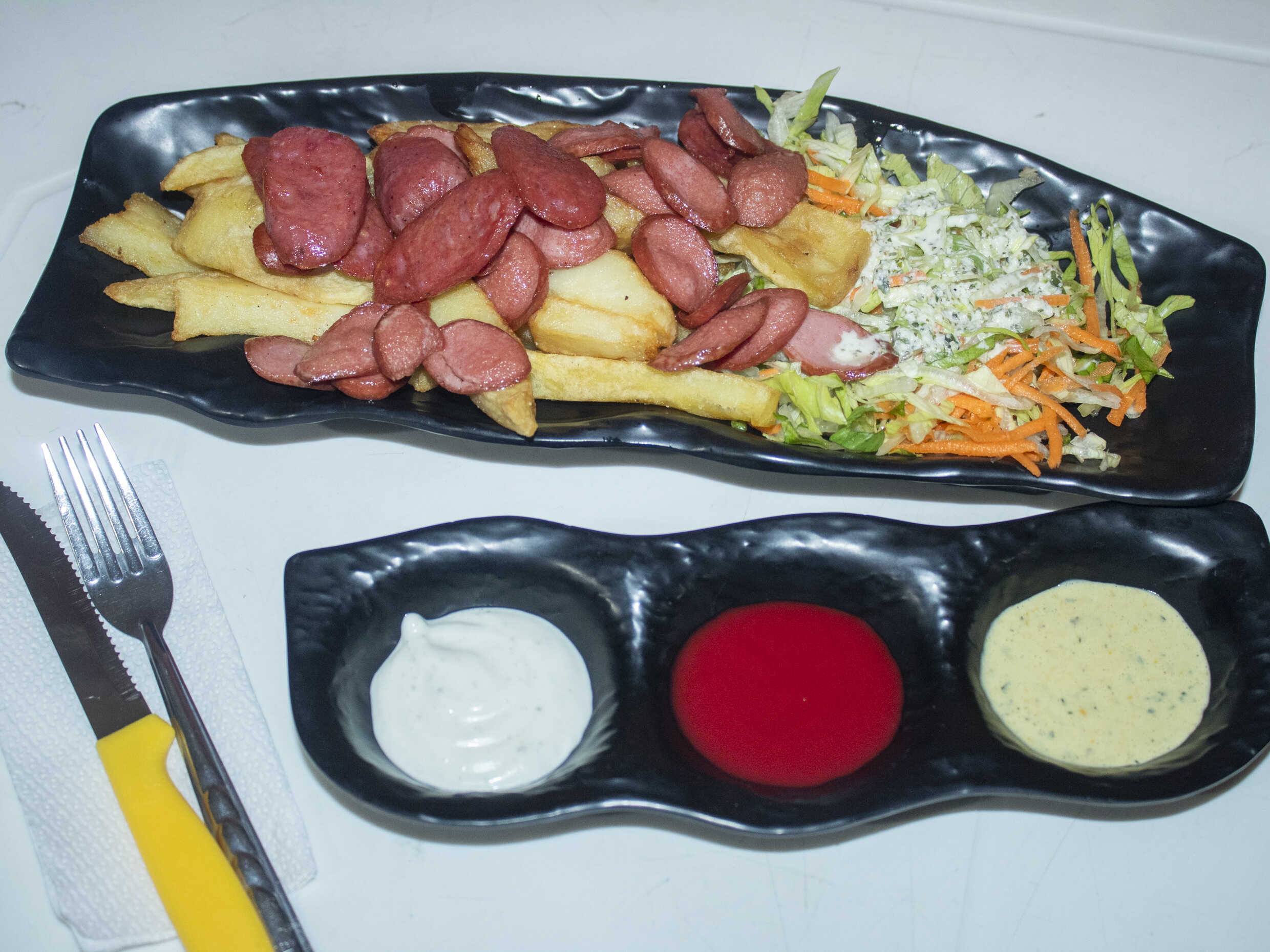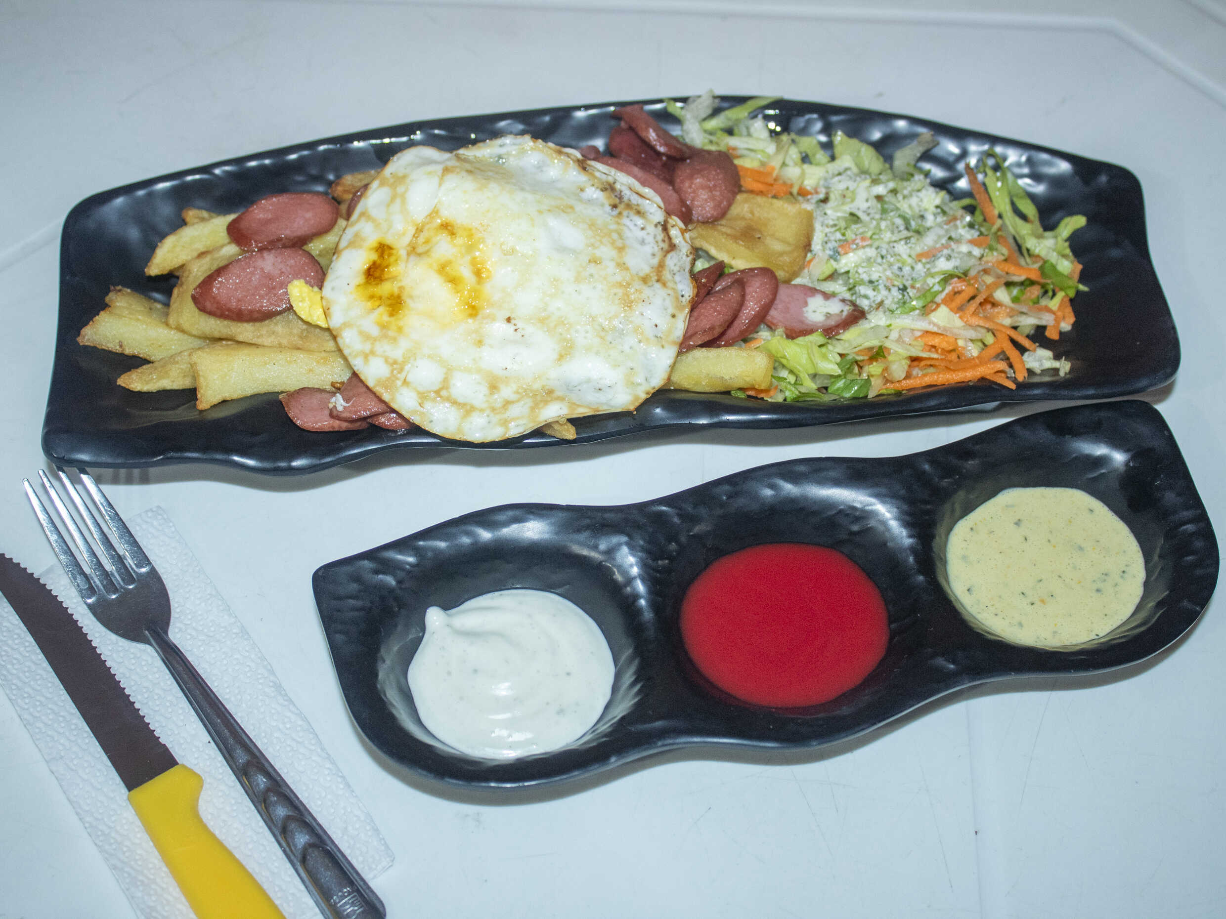 Salchipapa a lo pobre con hot dog, plátano, huevo, papas fritas, ensalada y cremas.