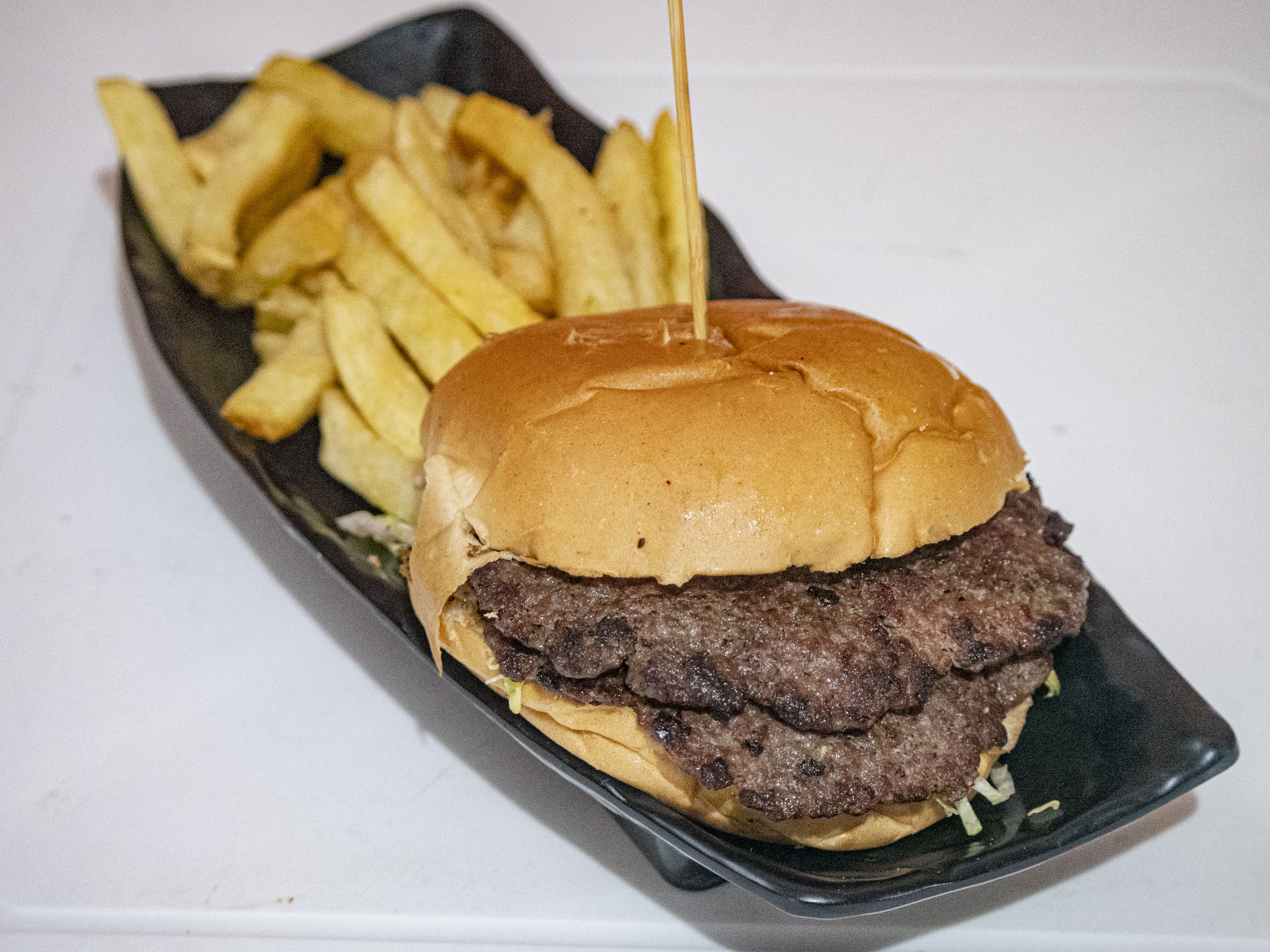 Hamburguesa doble clásica a elegir entre filete de pollo o carne artesanal, pan de hamburguesa, papas fritas y ensalada.