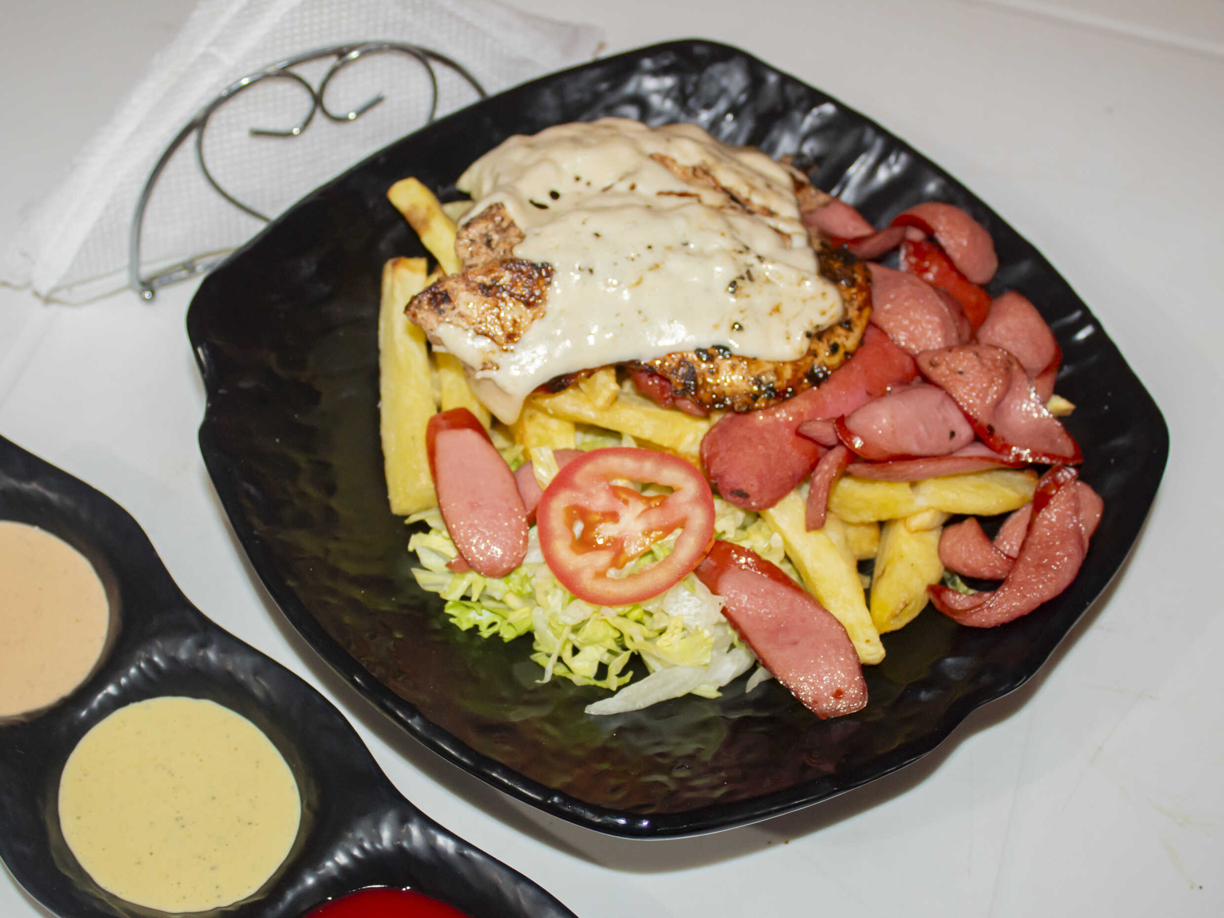 Salchipollo con hot dog, chorizo, trozos de pechuga, queso, papas fritas, ensalada y cremas.