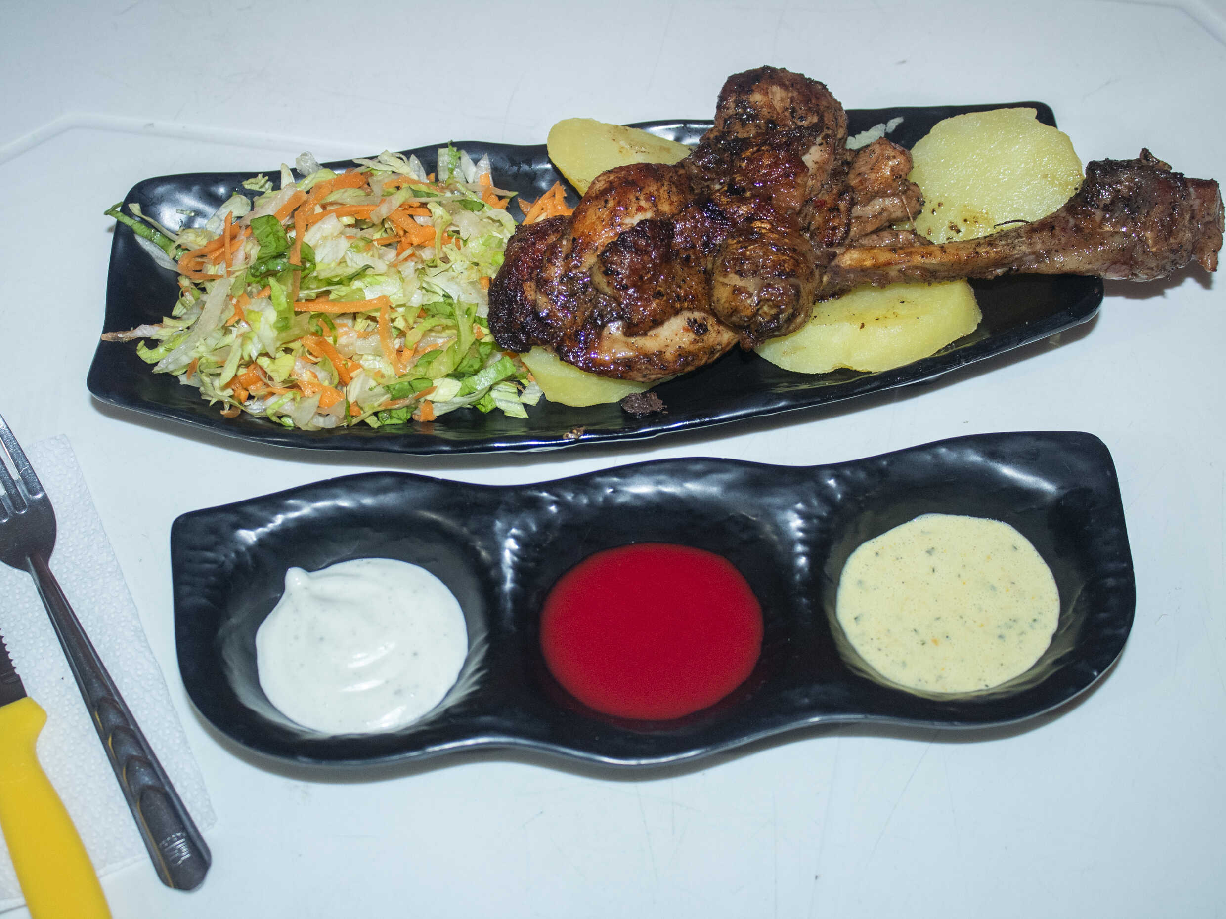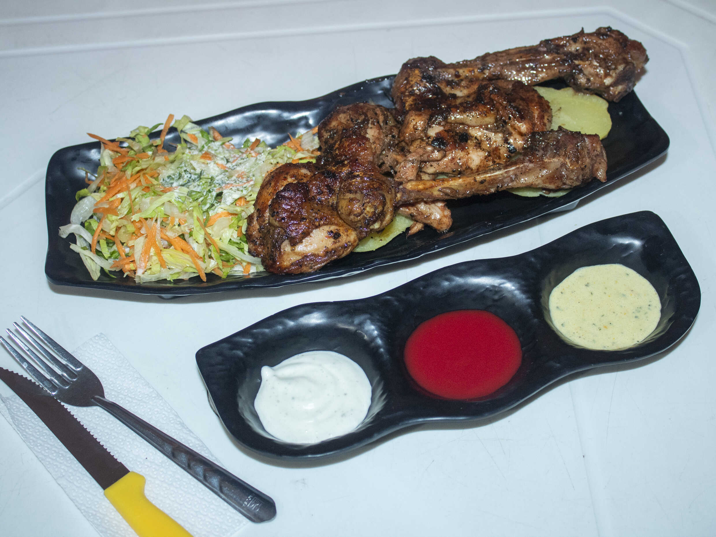 2 Piernas a la parrilla con papas al vapor, ensalada fresca y nuestros ajíes de la casa.