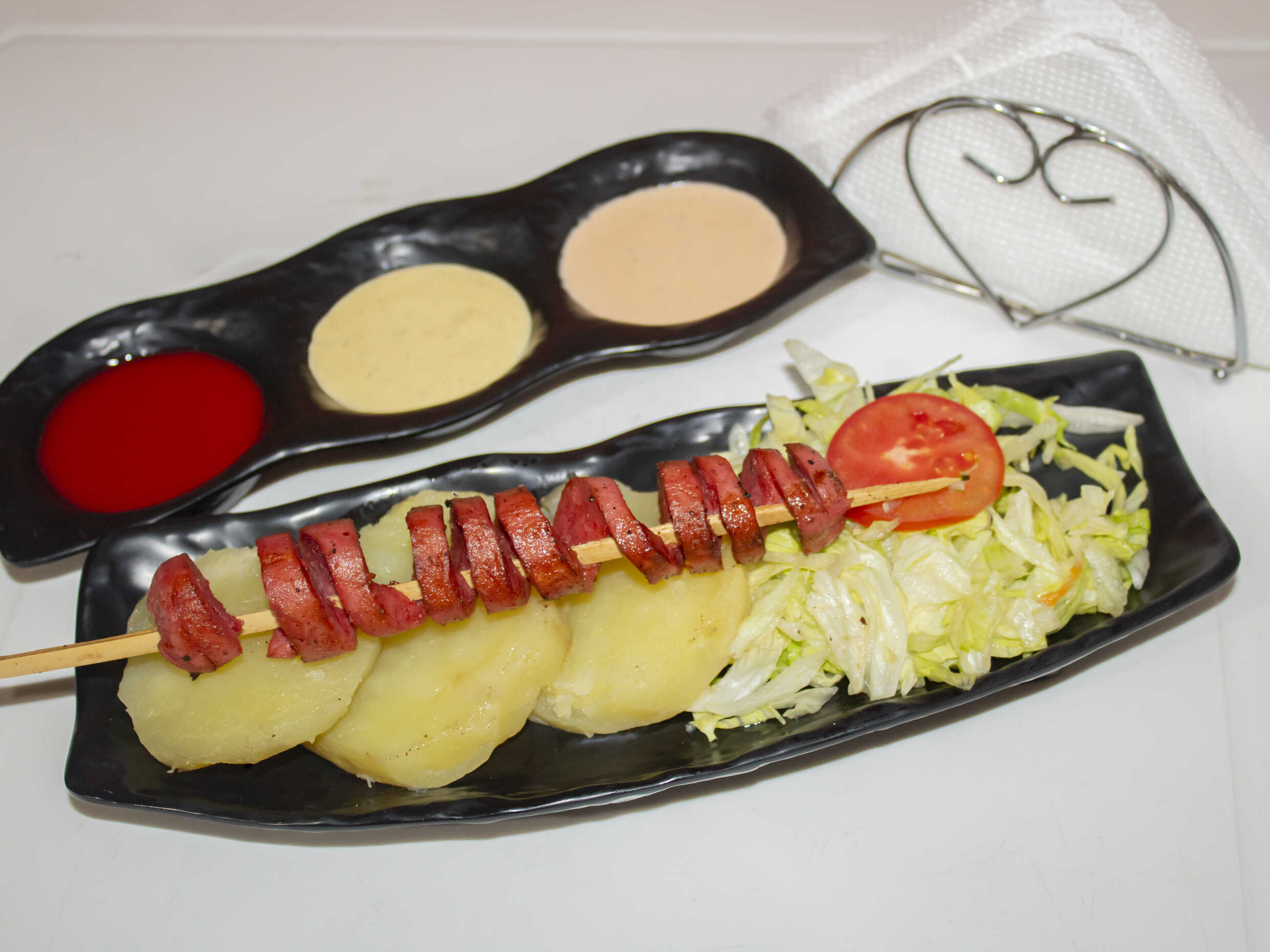 2 Palitos de anticuchos de corazón de res y rachi, papas al vapor, ensalada fresca y nuestros ajíes de la casa.