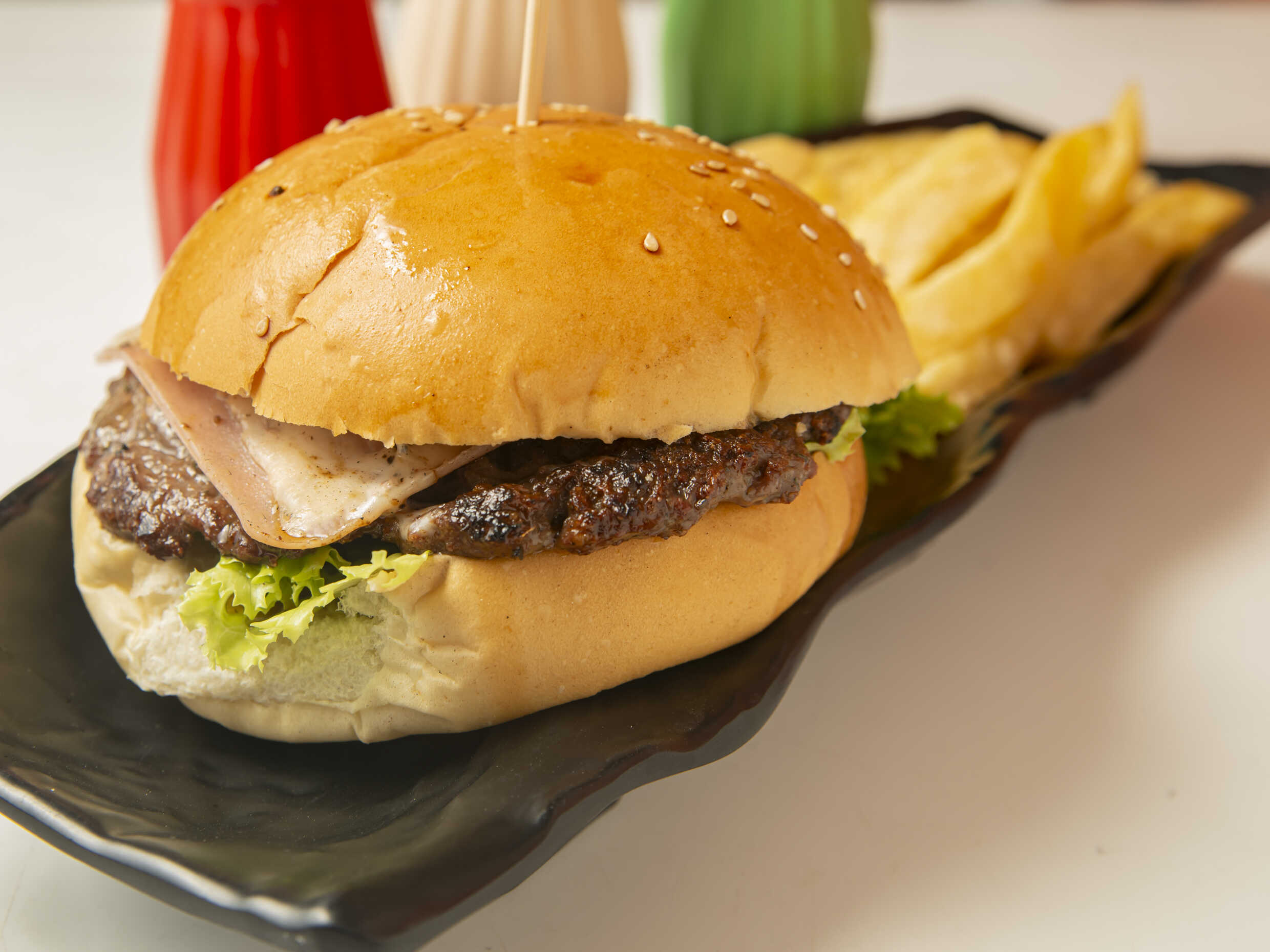 Hamburguesa sabrosa a elegir entre filete de pollo o carne artesanal, queso, jamón, pan de hamburguesa, papas fritas y ensalada.