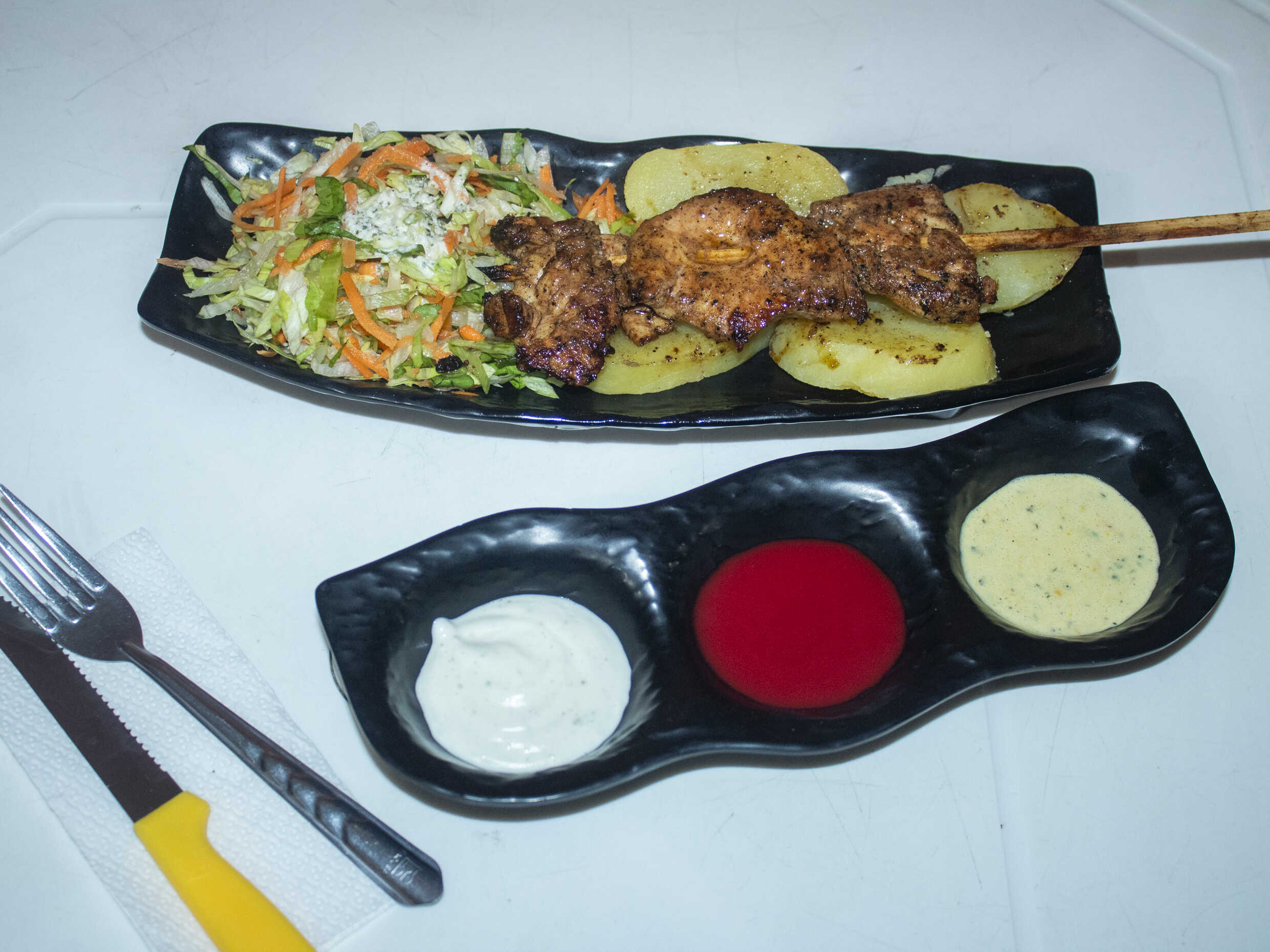 1 Palito de anticucho de pechuga, papas al vapor, ensalada fresca y nuestros ajíes de la casa.