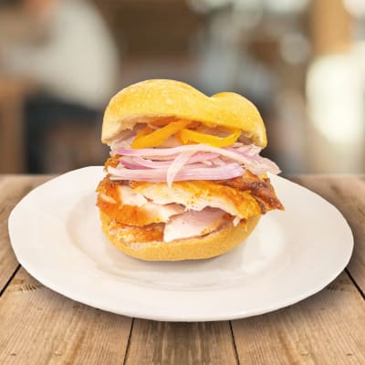 Pan francés, pollo deshilachado, cebolla, tomate, lechuga, papas al hilo y mayonesa.