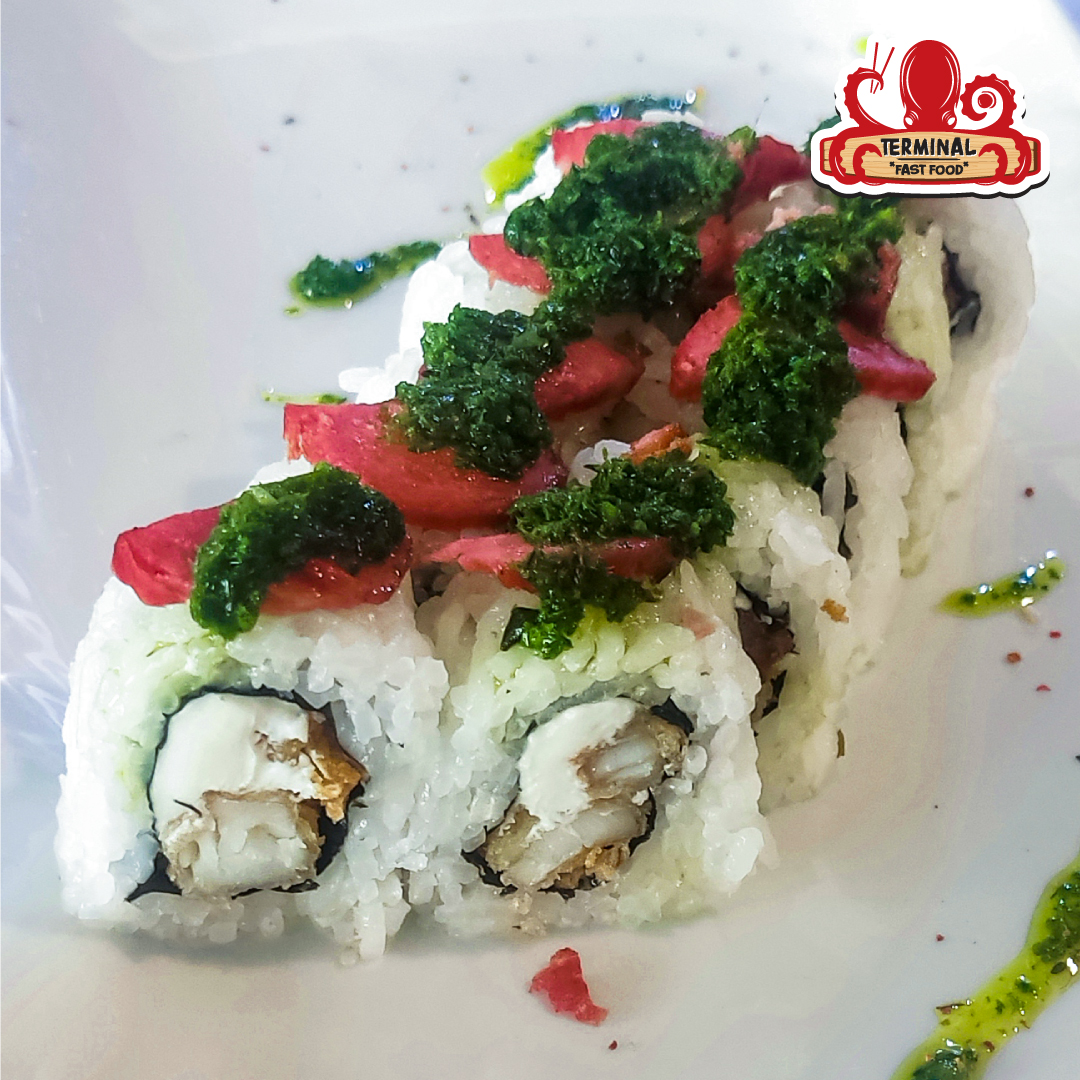 Relleno de pescado furai y palta, bañado con salsa acevichada y salsa de rocoto, coronado con chicharrón de pescado., 12 cortes.