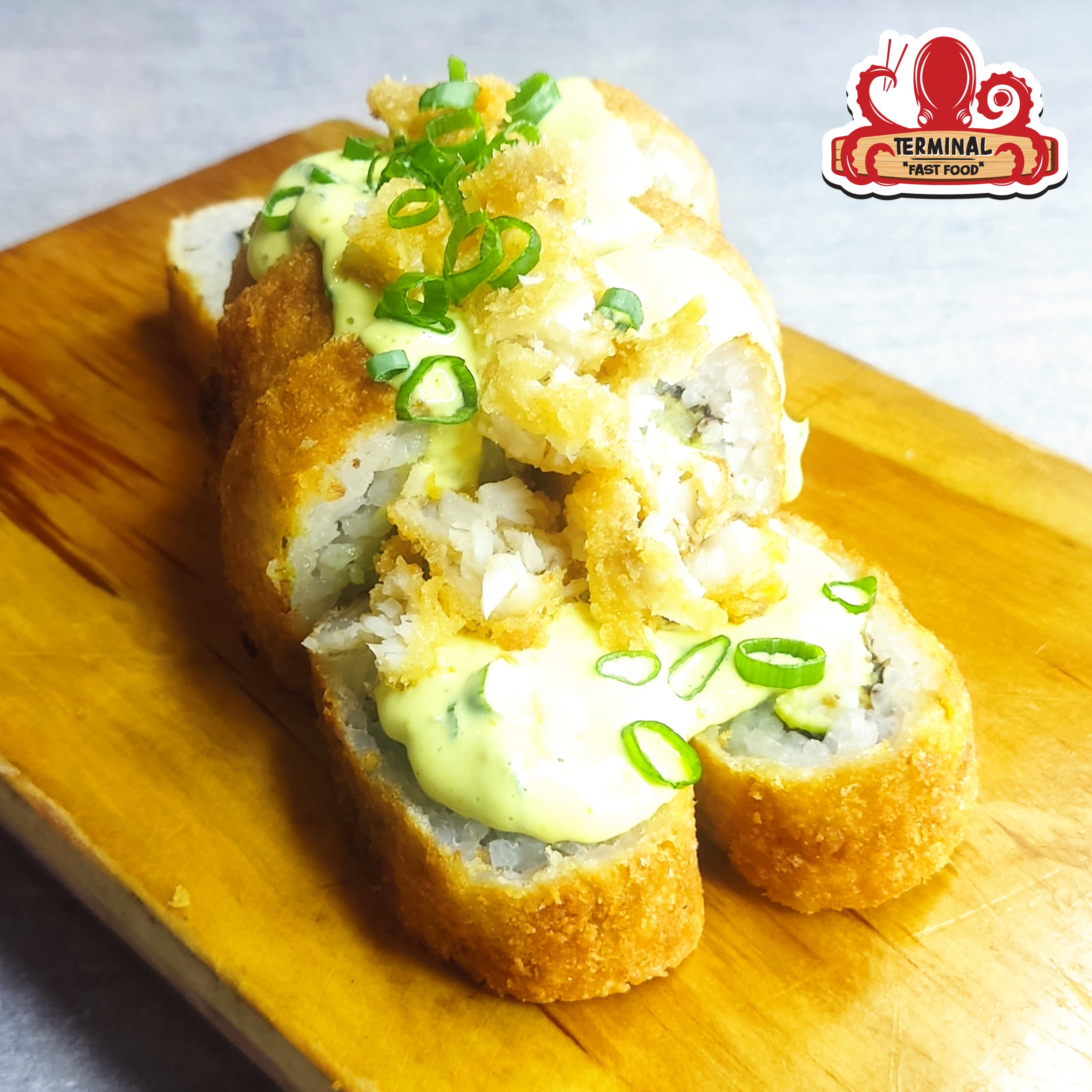 Relleno de pescado furai y palta, empanizado con panko, bañado con salsa tártara, coronado con chicharrón de pescado, 12 cortes.