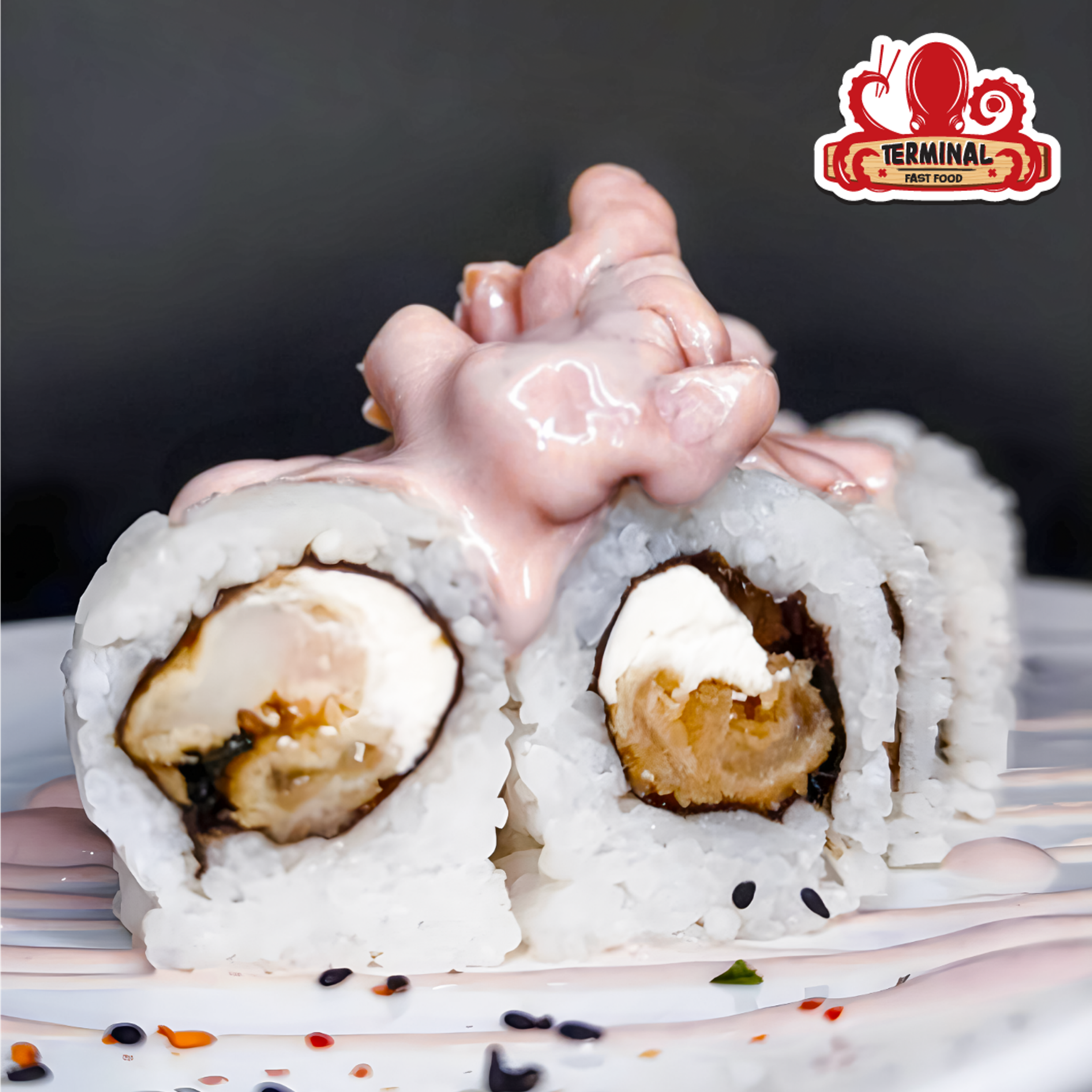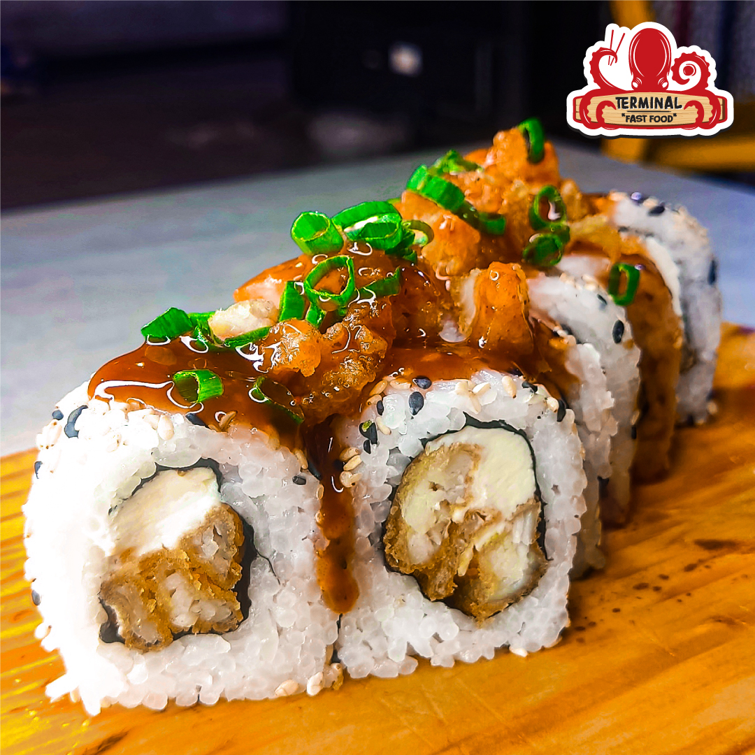 Relleno de pescado furai y queso crema, cubierto con pollo deshilachado, bañado en salsa bbq y toques de ajonjolí adornado con cebolla china, 12 cortes.