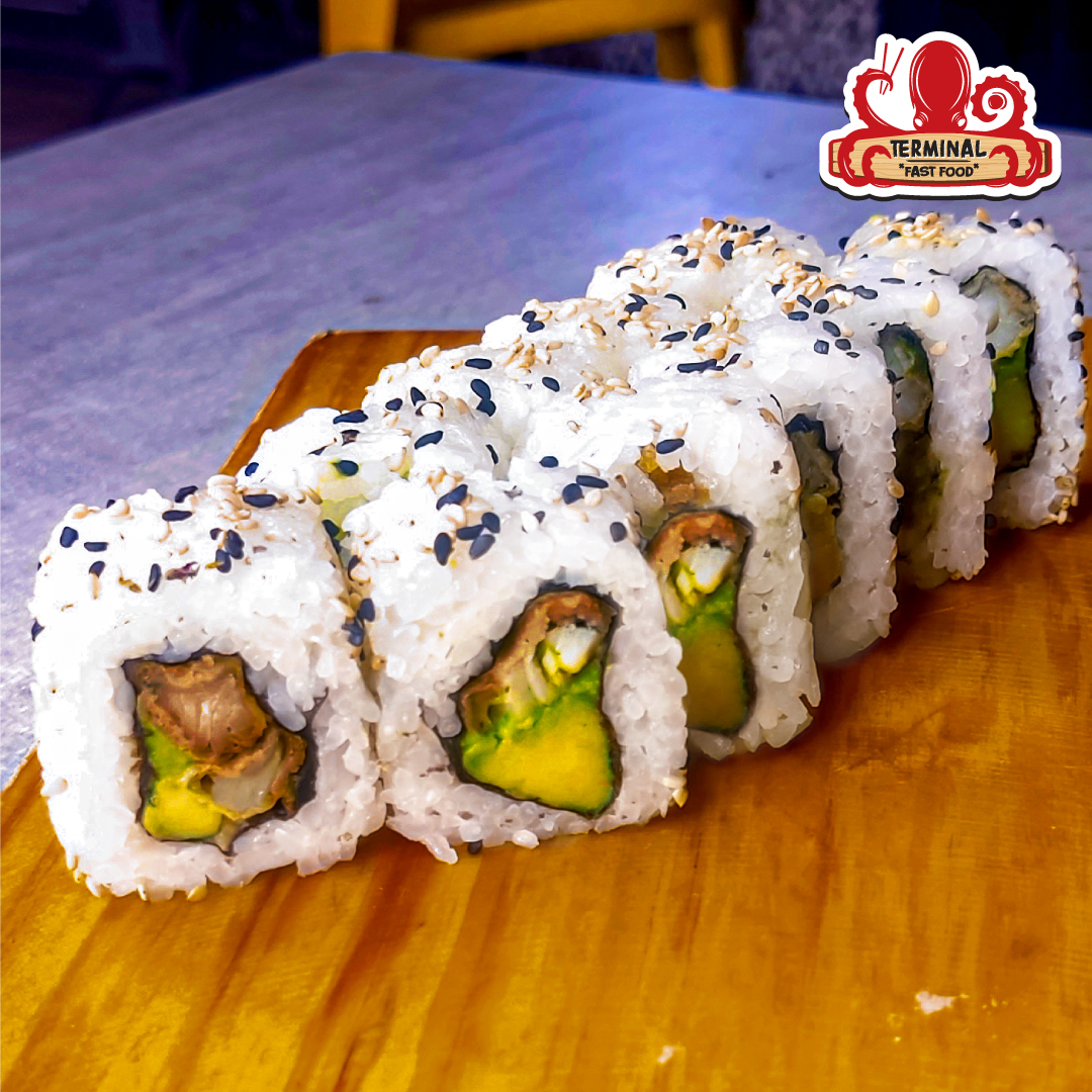 Relleno de pescado furai y palta, bañado con salsa acevichada y salsa de rocoto, coronado con chicharrón de pescado, 12 cortes.