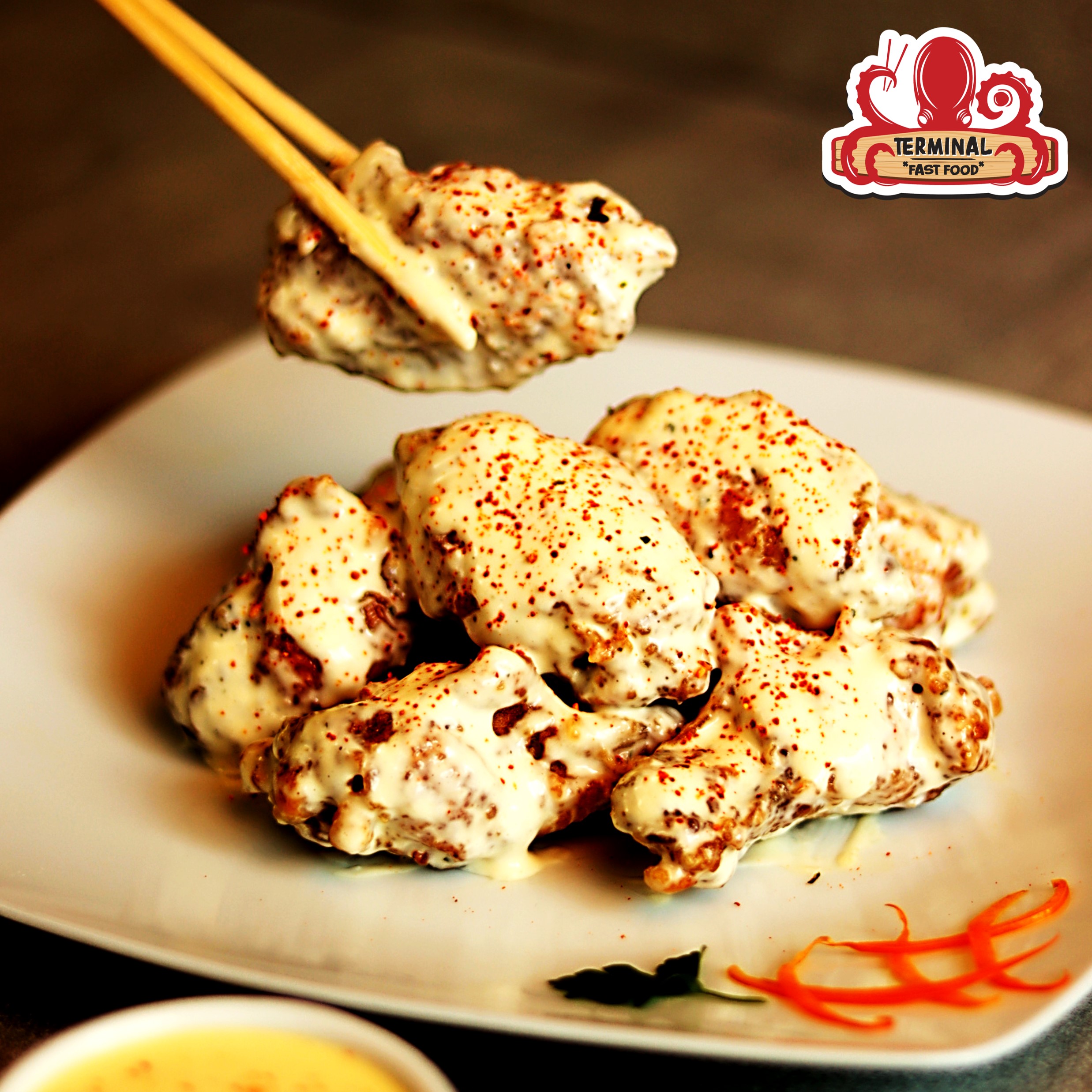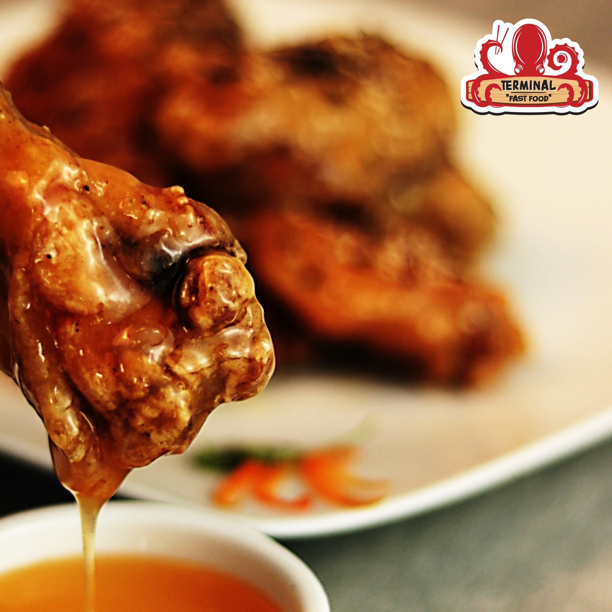 6 Crocantes piezas de pollo, bañadas en deliciosa salsa dulce de maracuyá.