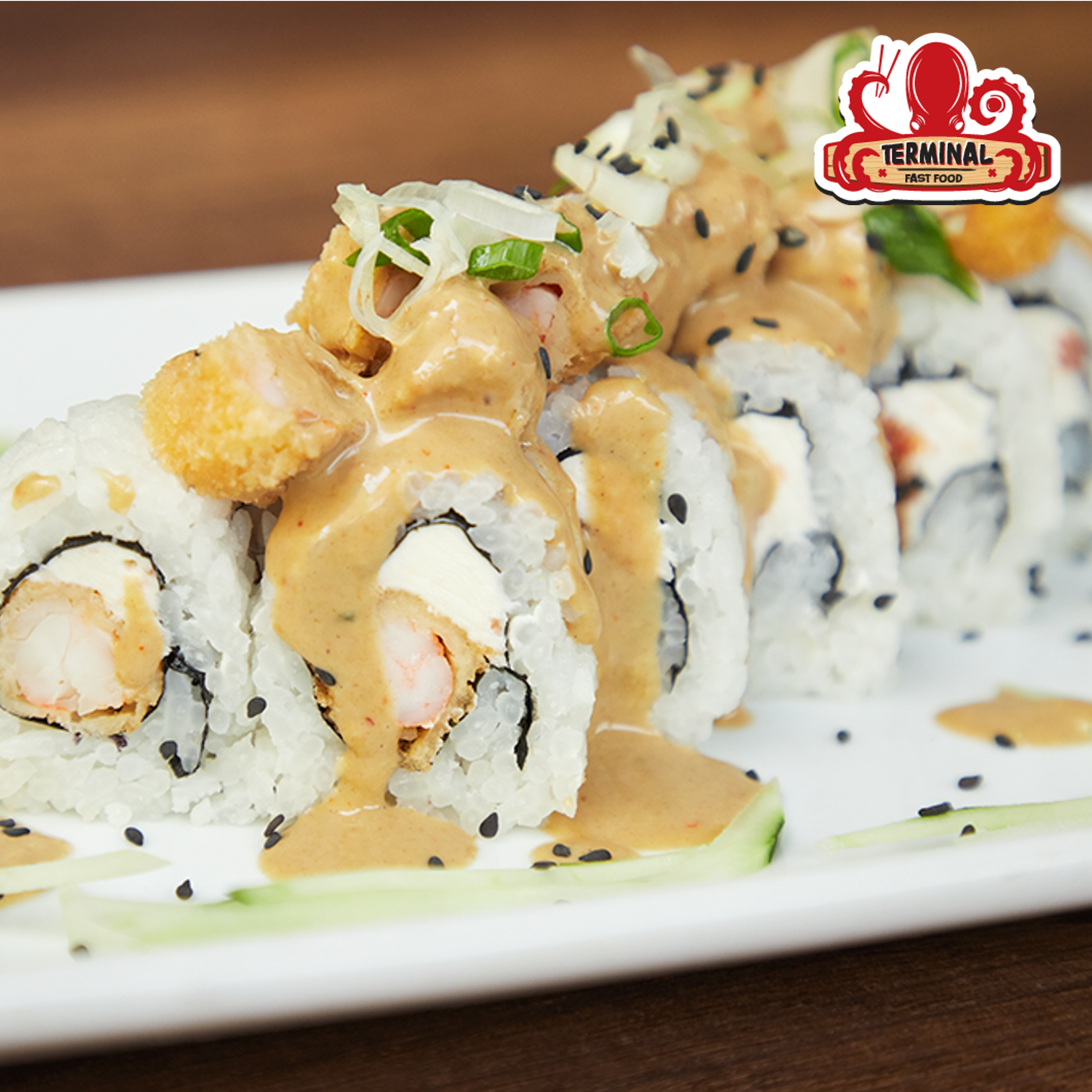 Relleno de pescado furai y queso crema, bañado con deliciosa salsa nikkei, coronado con chicharrón de pescado y cebolla china, 12 cortes.