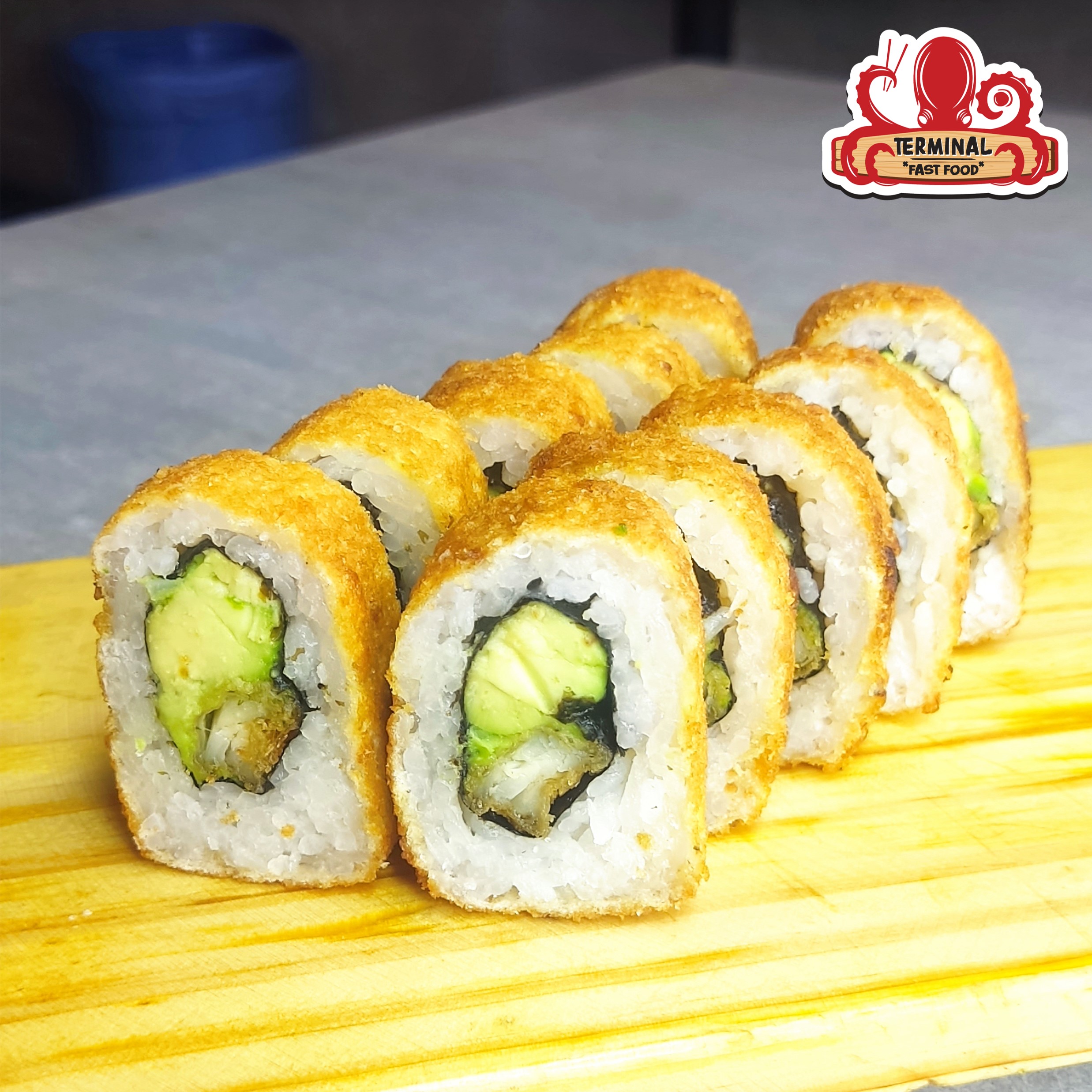 Relleno de pescado furai y palta empanizado con panko, bañado en salsa acevichada y togarashi, 12 cortes.