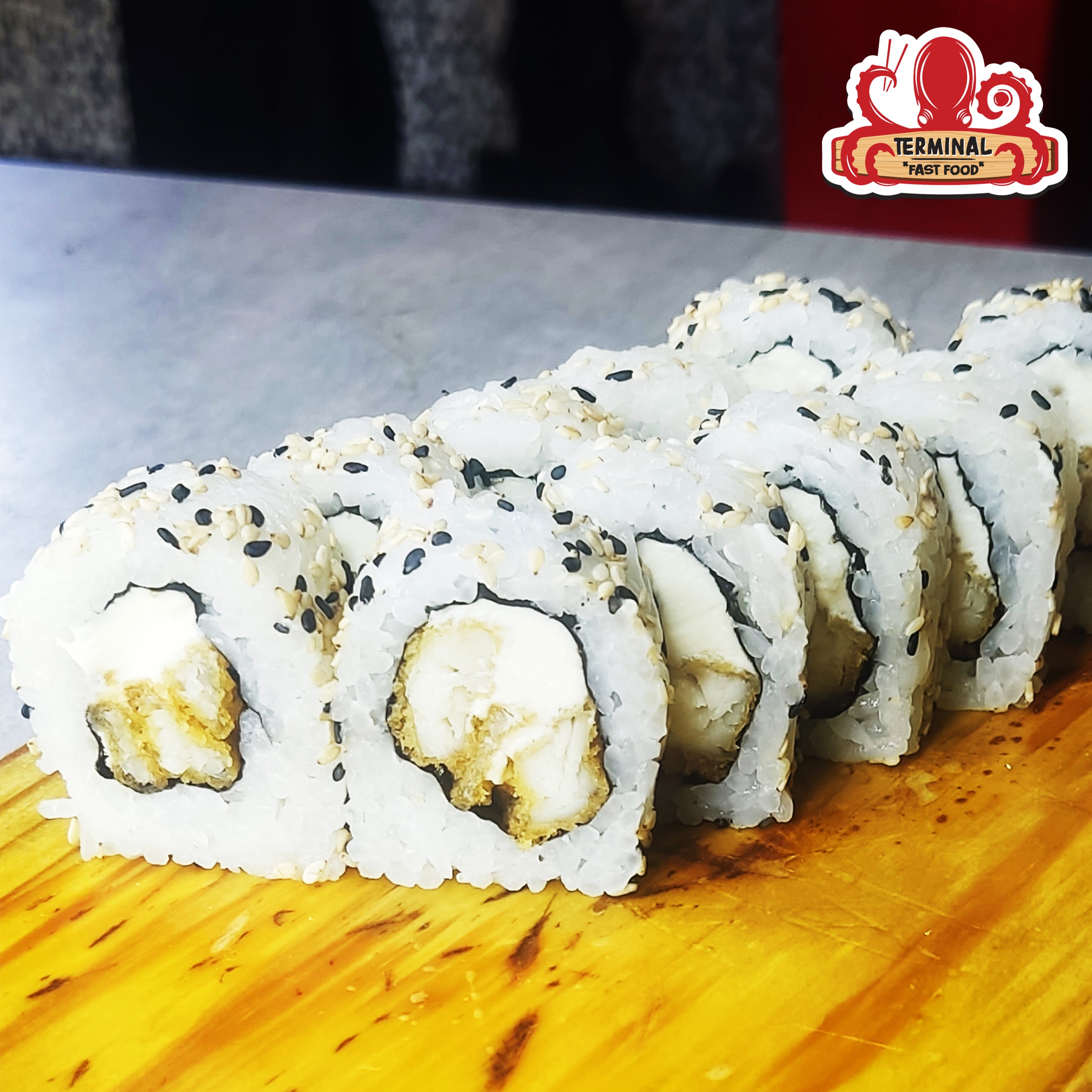 Relleno de pescado furai y palta, coronado con pulpa de langostinos en salsa golf y un toque de palta, 12 cortes.