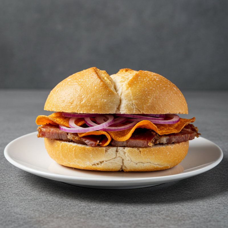 Tradicional pan francés con Chicharrón de cerdo, zarza criolla y chips de camote.