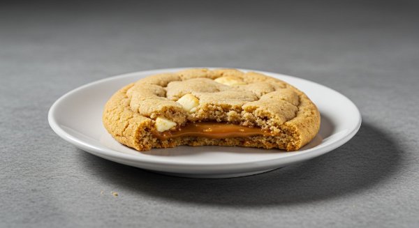 Galleta de vainilla con chunks de chocolate blanco y relleno de manjar blanco.