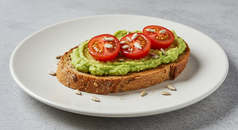 Pan campesino con puré de palta, huevo frito (opcional), tomate cherry.
