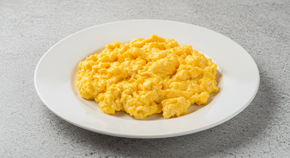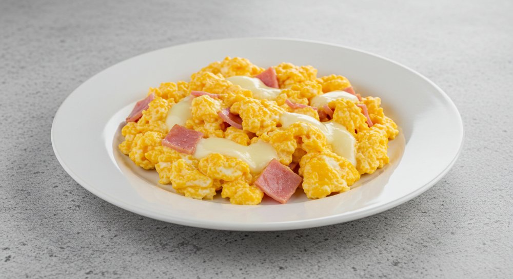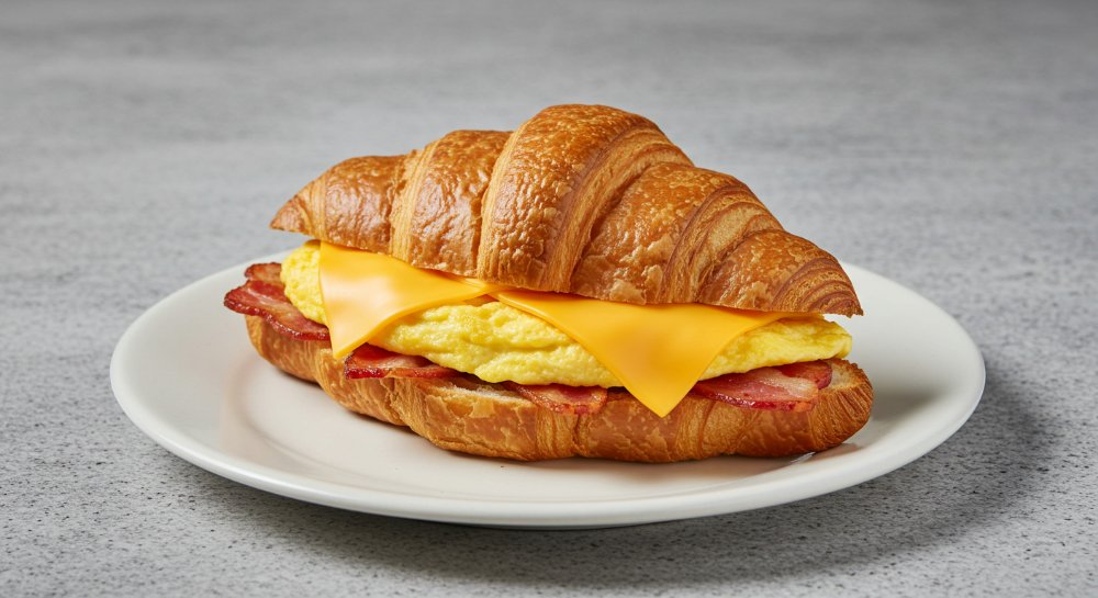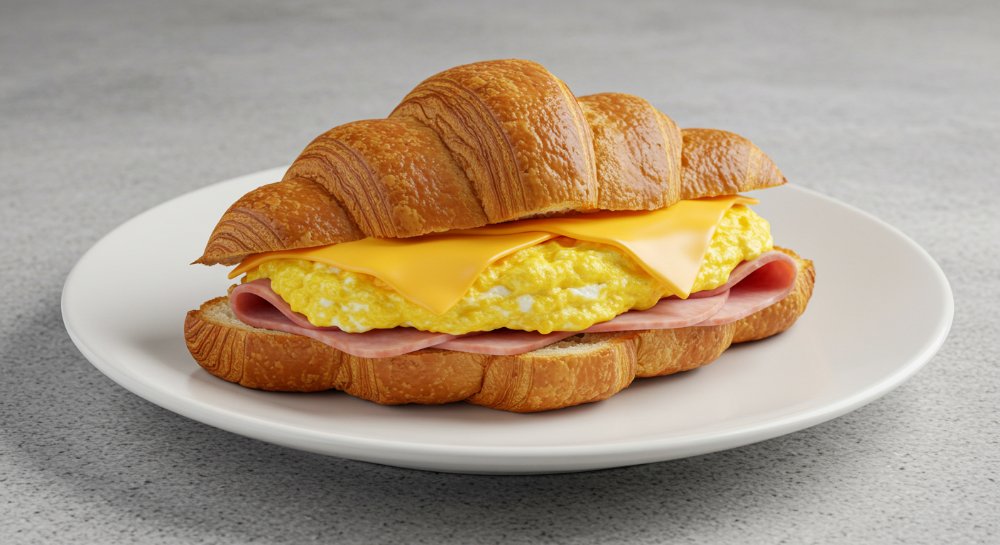 Croissant con huevo revuelto, queso y jamón de cerdo.