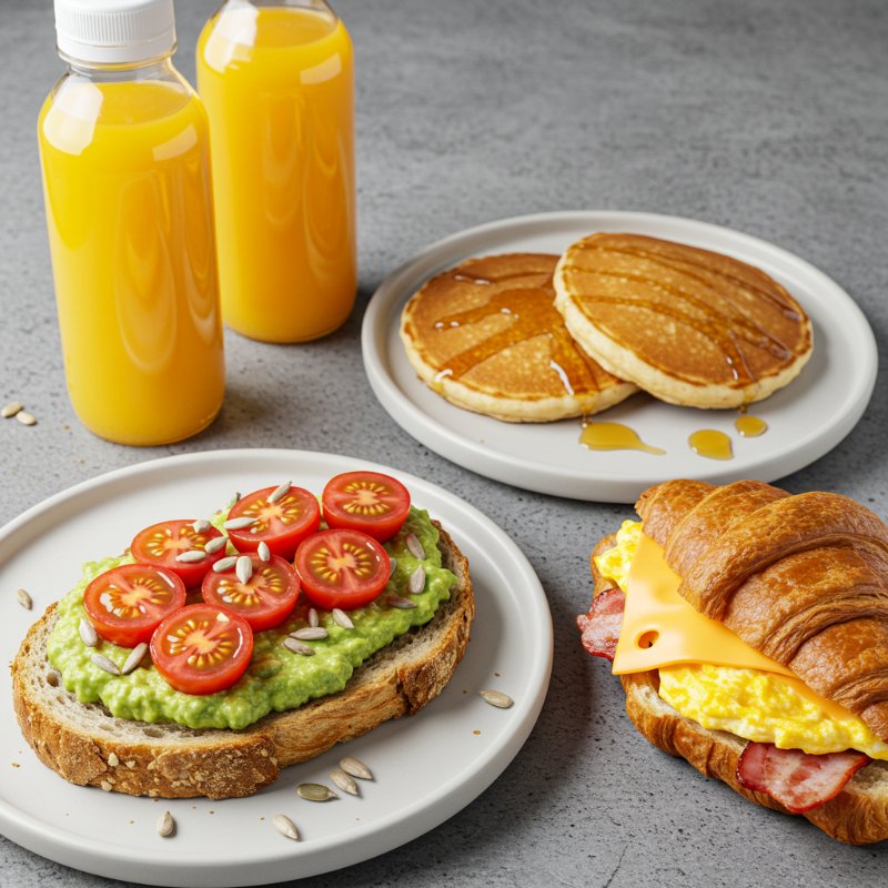 Incluye una tostada de palta, un croissant de huevo, tocino y queso, unos pancakes tradicionales para compartir y dos bebidas.