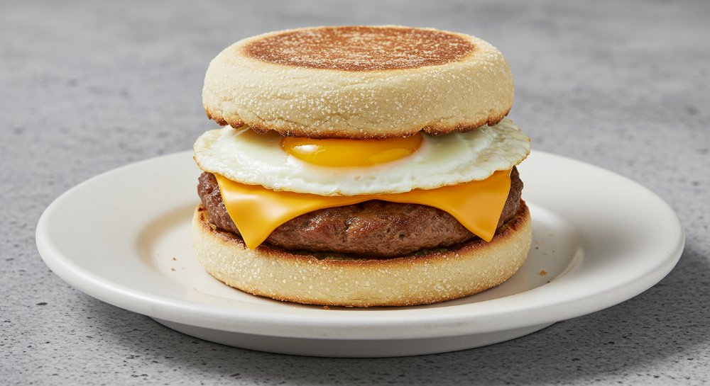 Sandwich en pan tipo muffin inglés (salado) con huevo frito, carne de res y queso cheddar.