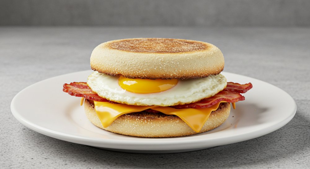 Sandwich en pan tipo muffin inglés (salado) con huevo frito, Tocino y queso cheddar.