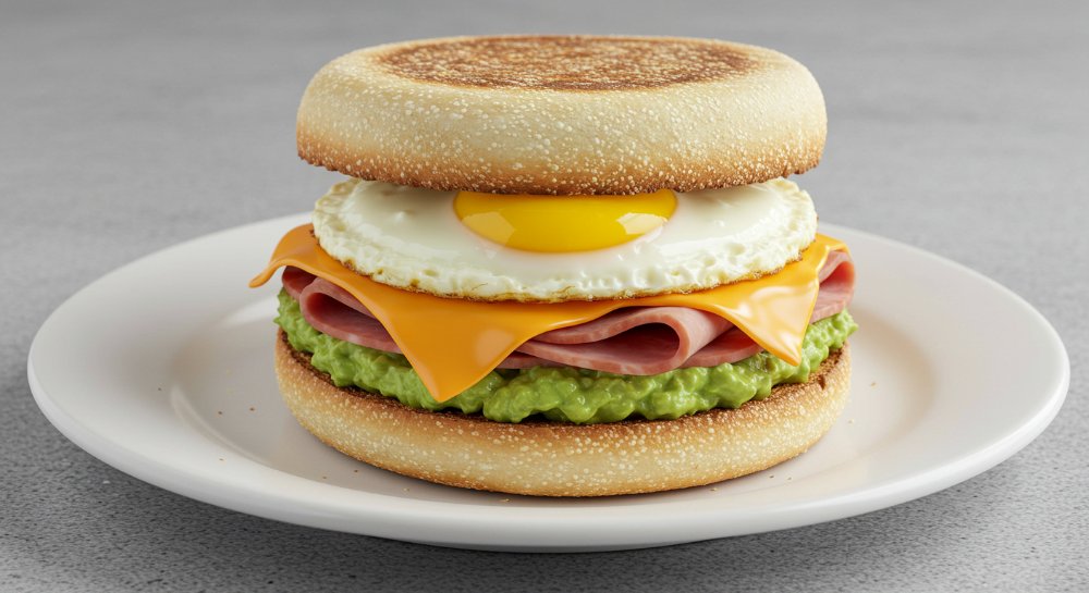Sandwich en pan tipo muffin inglés (salado) con huevo frito, palta, jamón york y queso cheddar.