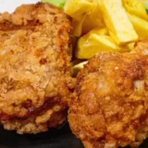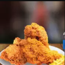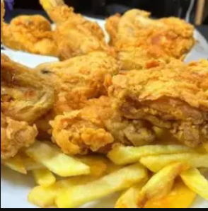 Porción individual de pecho broaster, acompañado de papas fritas y arroz chaufa. 🍗🍟🍚