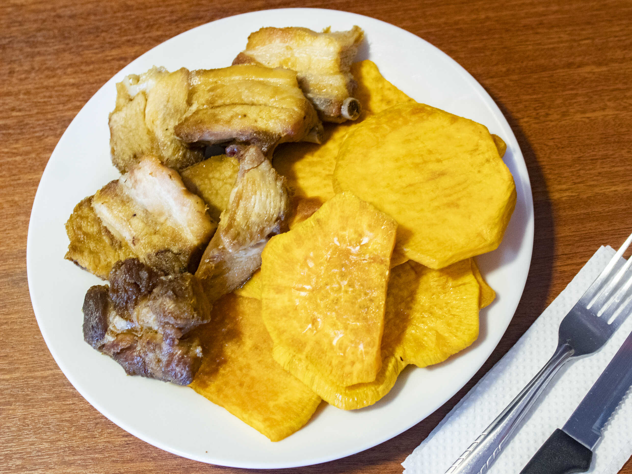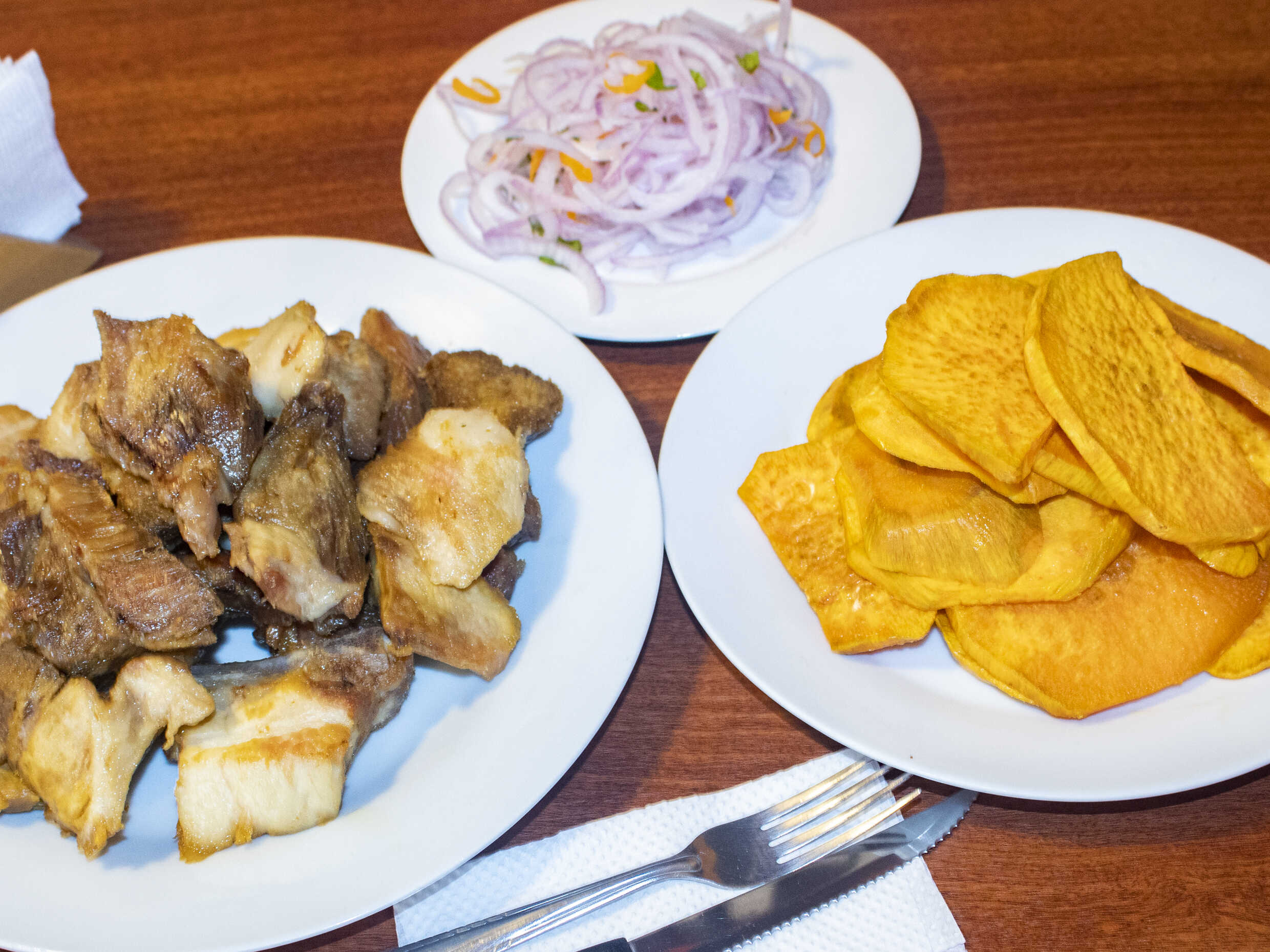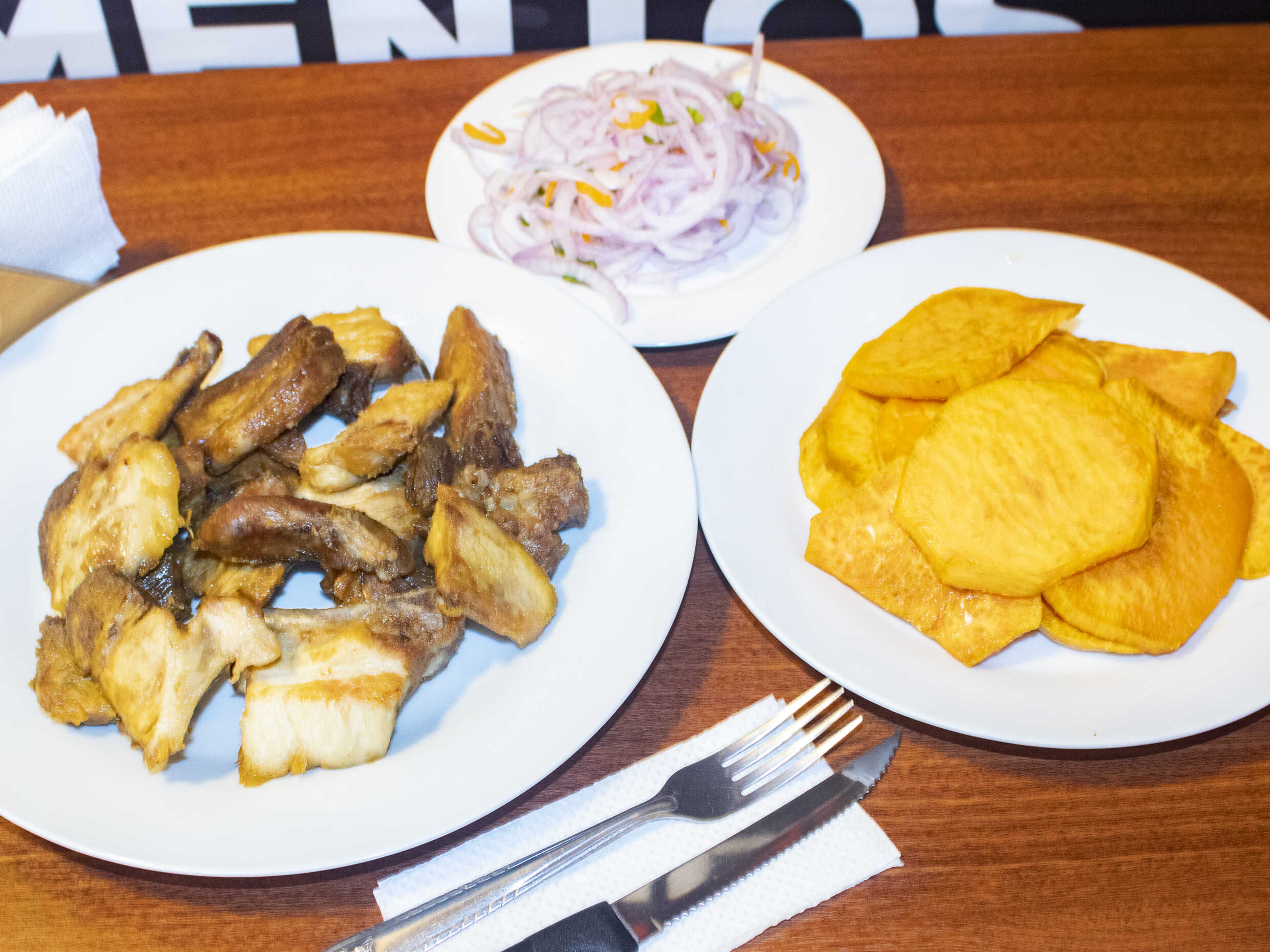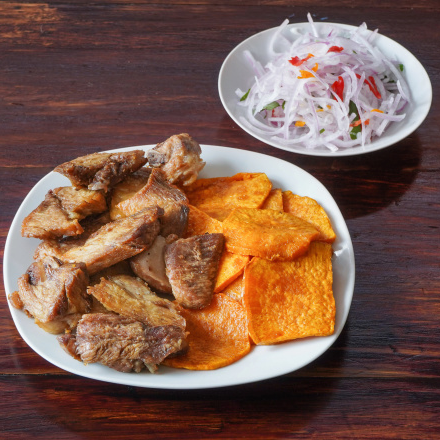 1/4 kg de chicharrón, porción de camote y cebolla criolla.