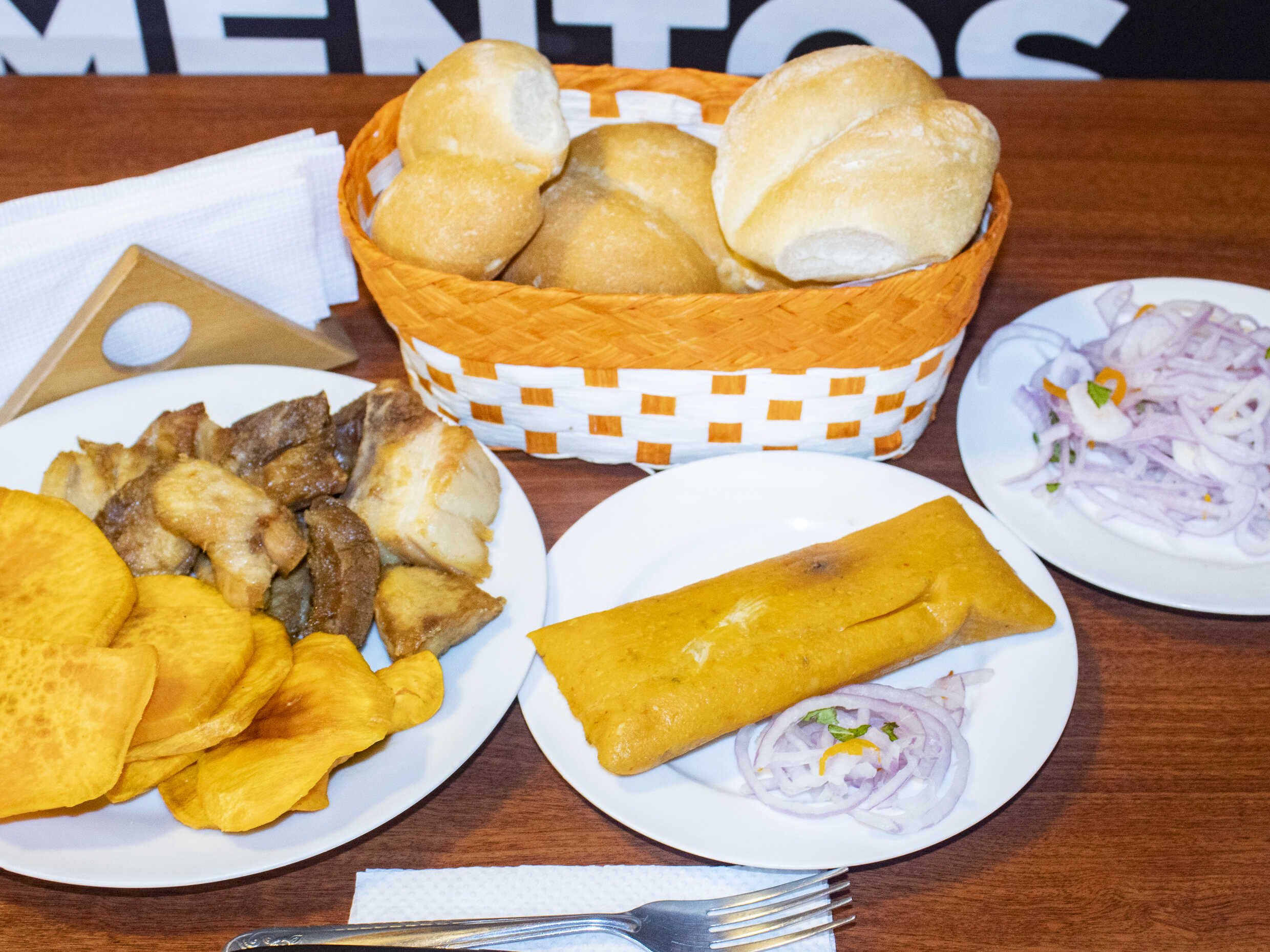 1/4 kg de chicharrón, porción de camote, 2 café pasado, 4 panes solos y cebolla criolla.