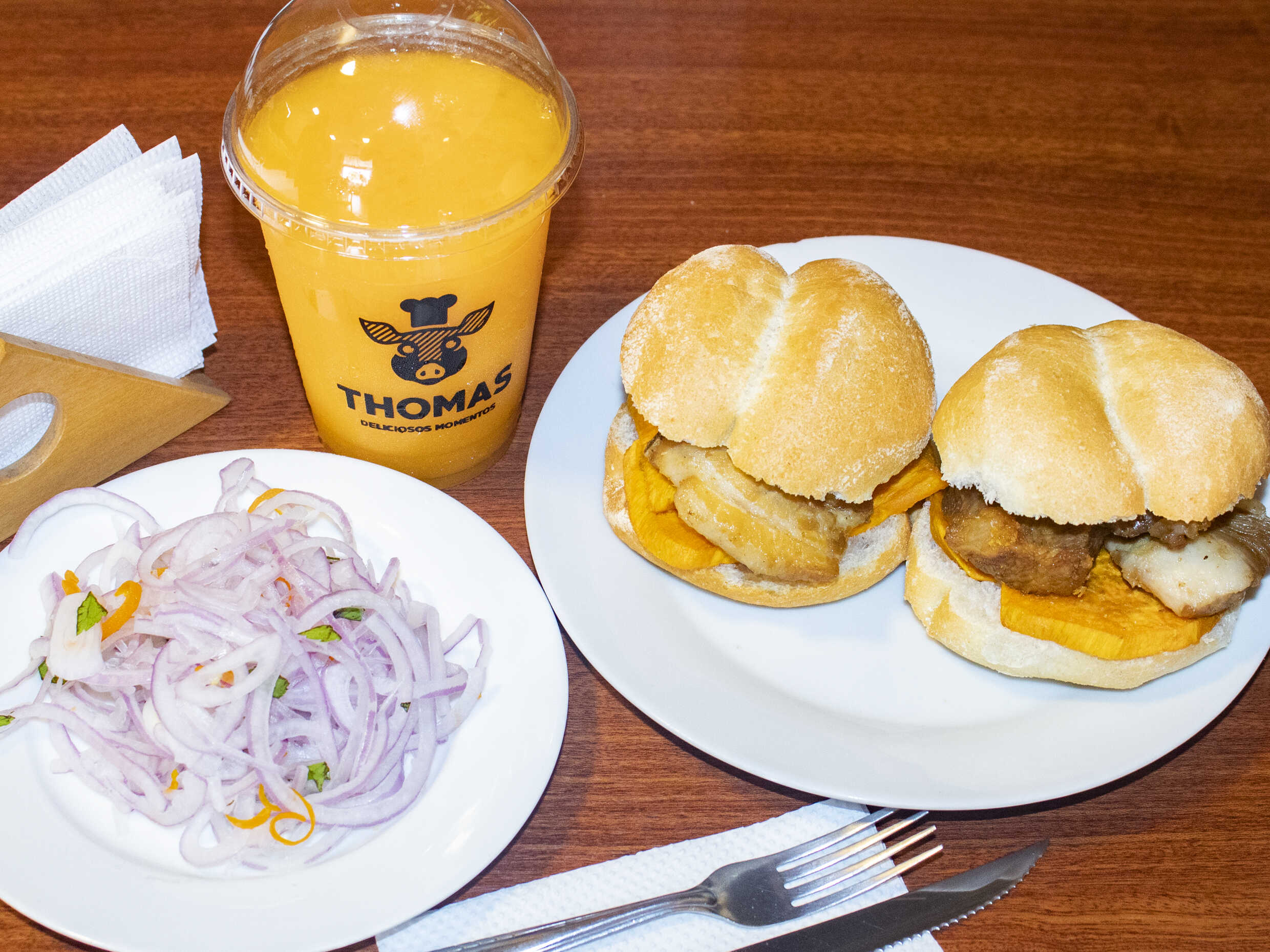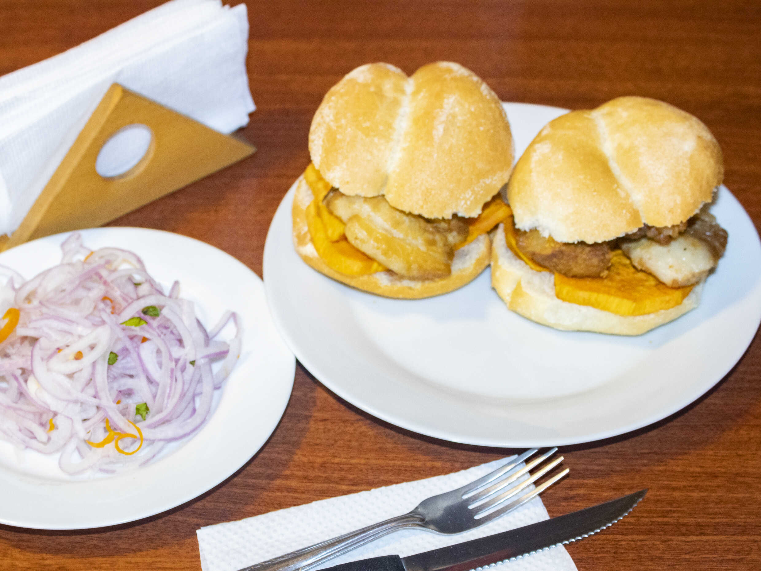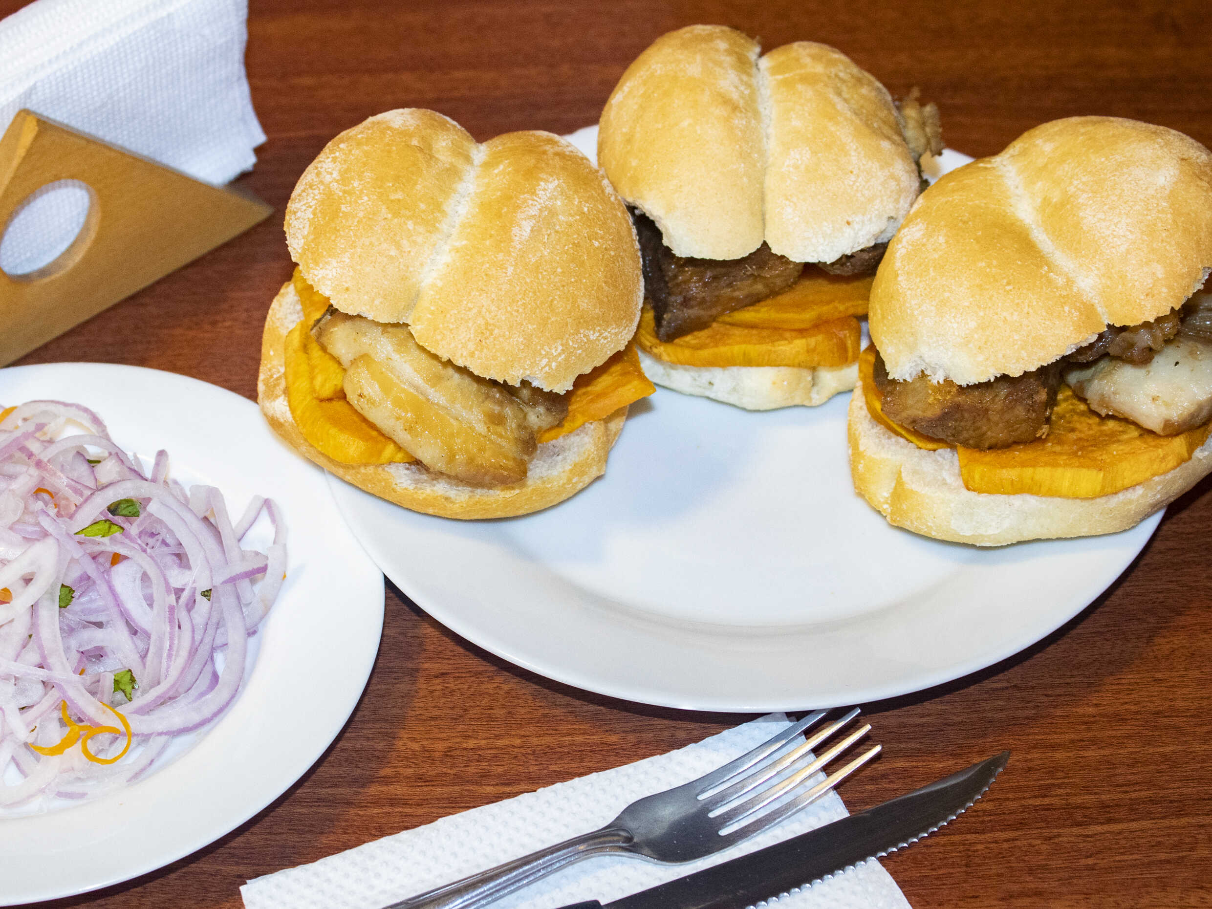 3 Sándwiches de chicharrón con camote y cebolla criolla. (Para máx. 2 personas)