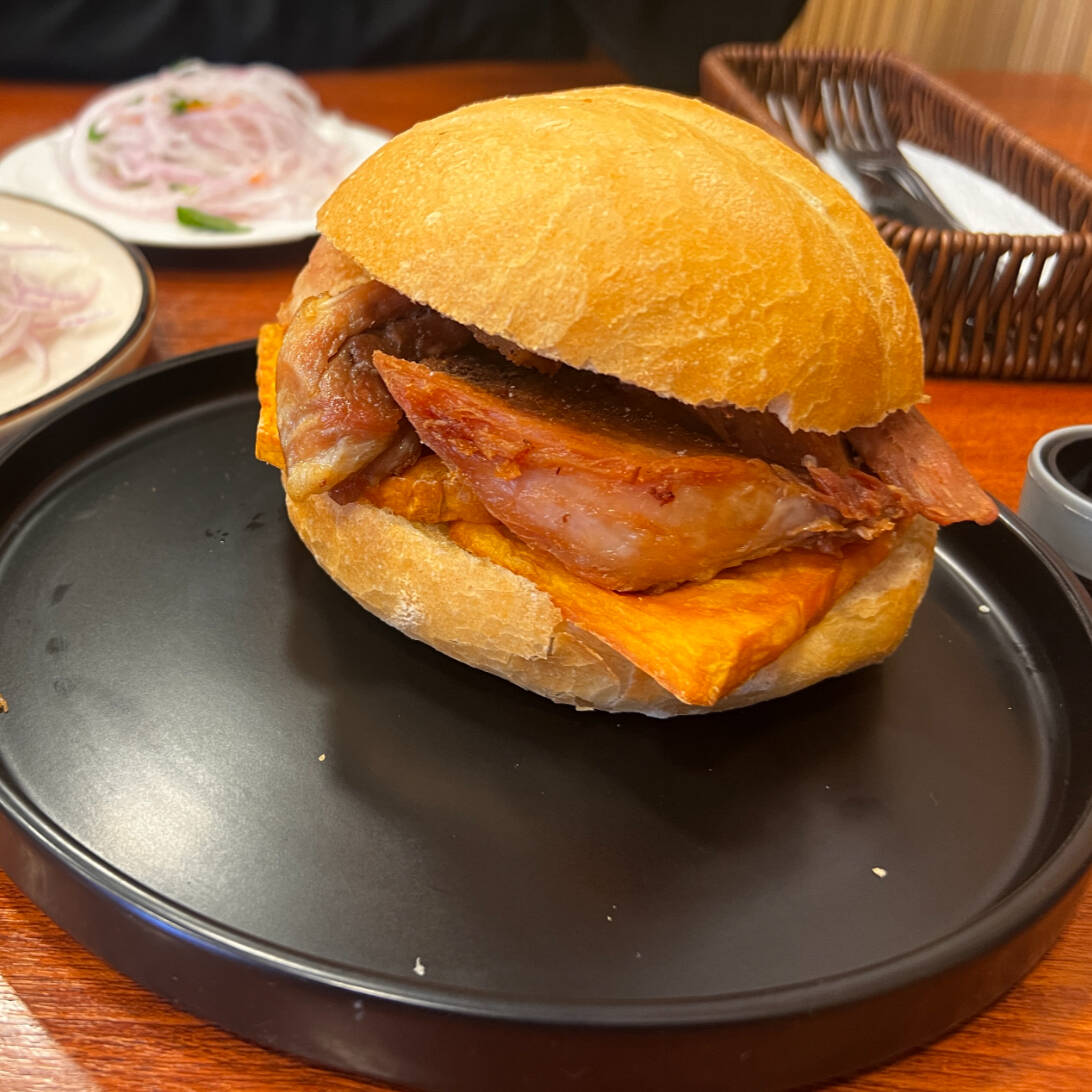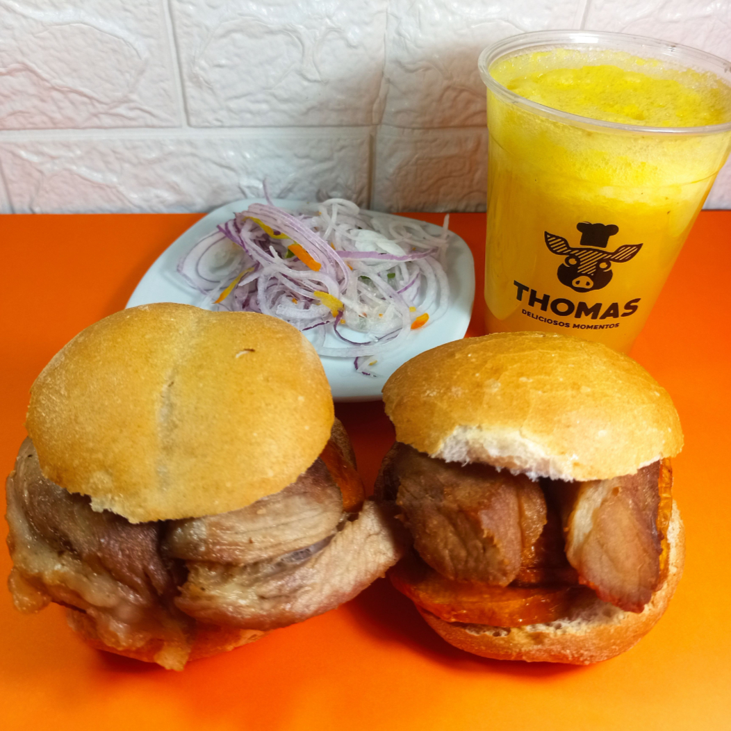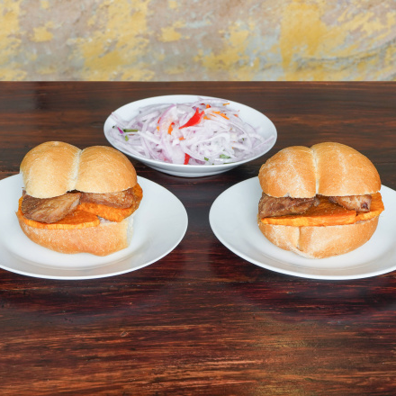 2 Sándwiches de chicharrón en total 125 g de chancho, camote y cebolla criolla. (Platillo personal)