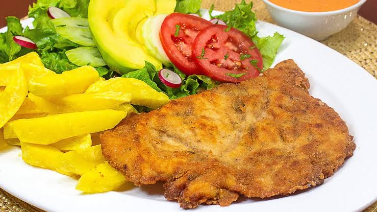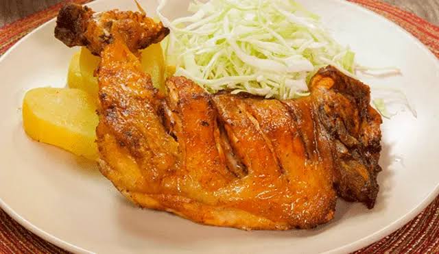 Con arroz, papas, ensalada con mayonesa y ají rocoto.