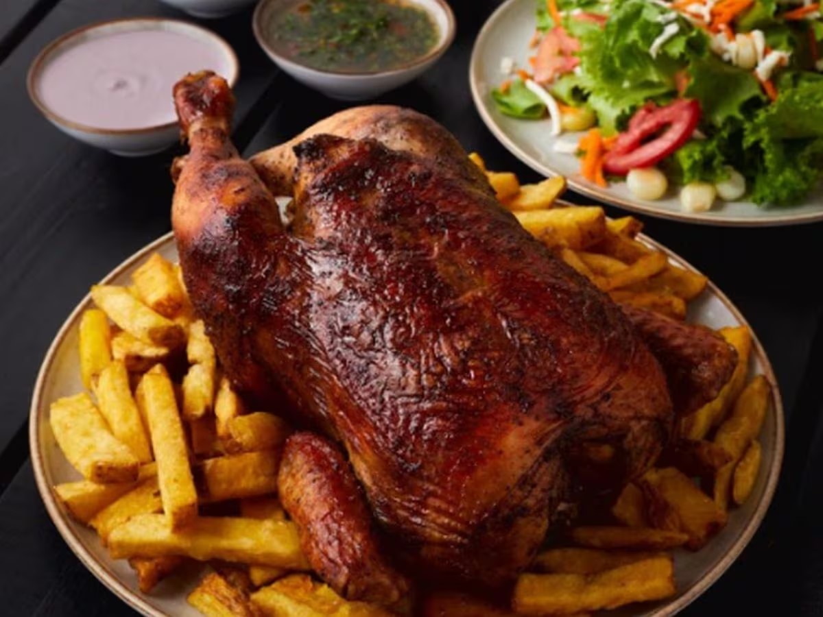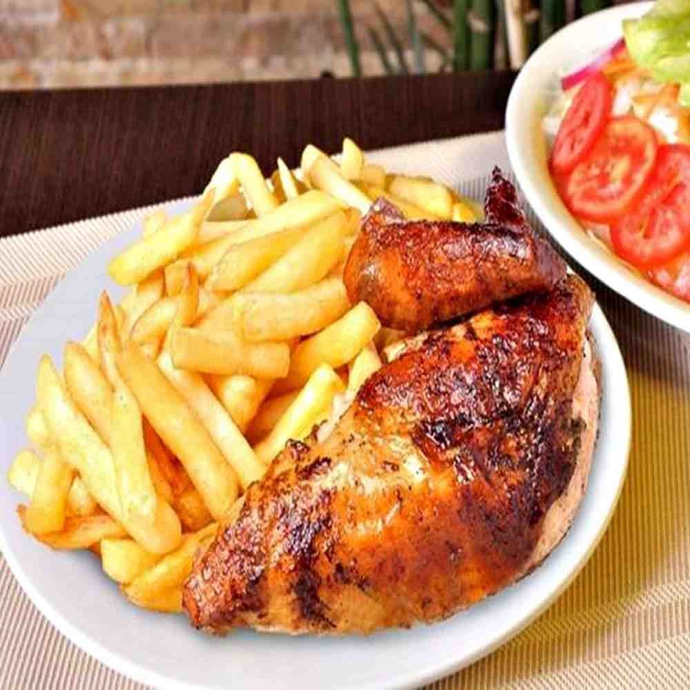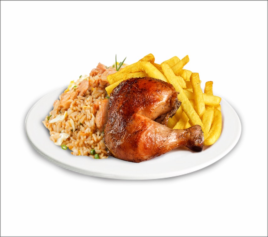 1/4 De pollo, papas a la francesa, ensalada más porción de arroz chaufa. (Pesa de 800 gr a 850 gr completo)